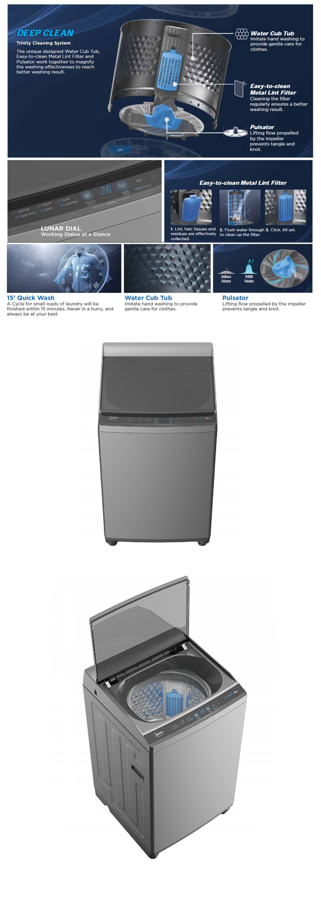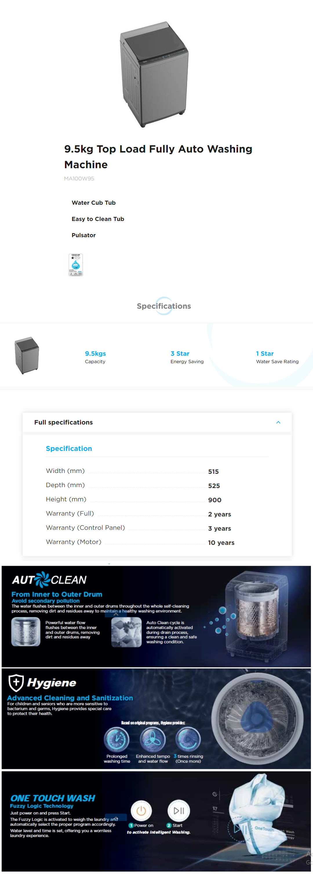 Midea 9.5KG Top Load Washing Machine MA100W95 | 5' Quick Wash | One-Touch Smart Wash | Auto Clean | Water Cub Tub | Washing Machine with 2 Year Warranty
