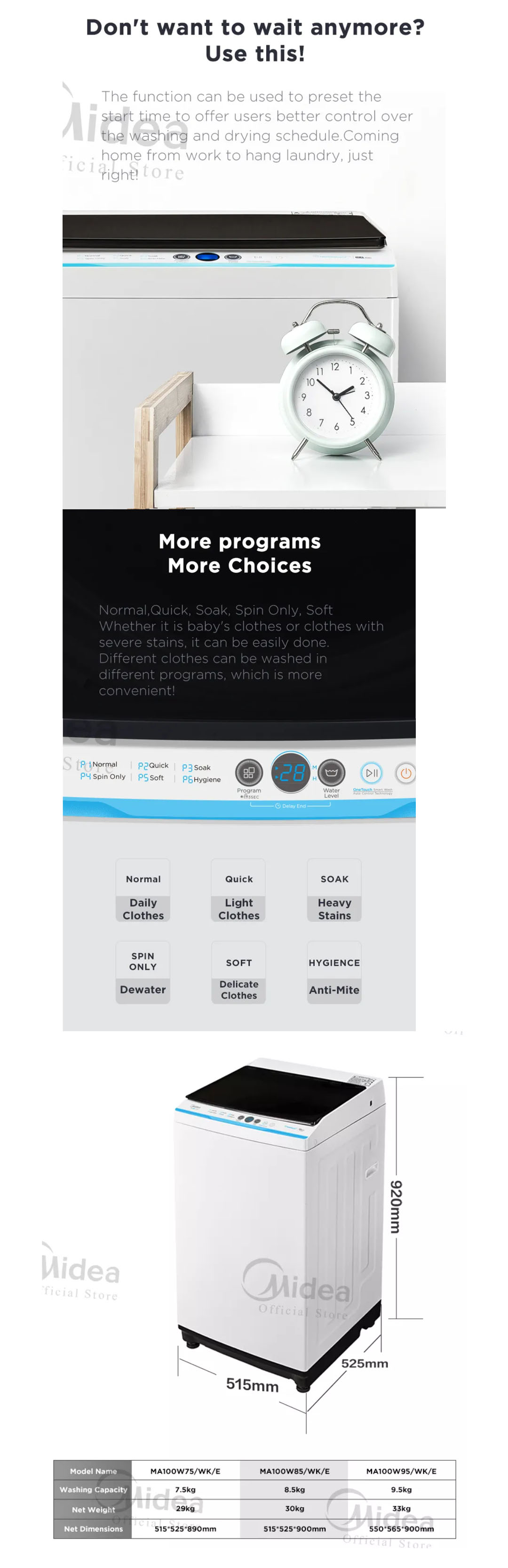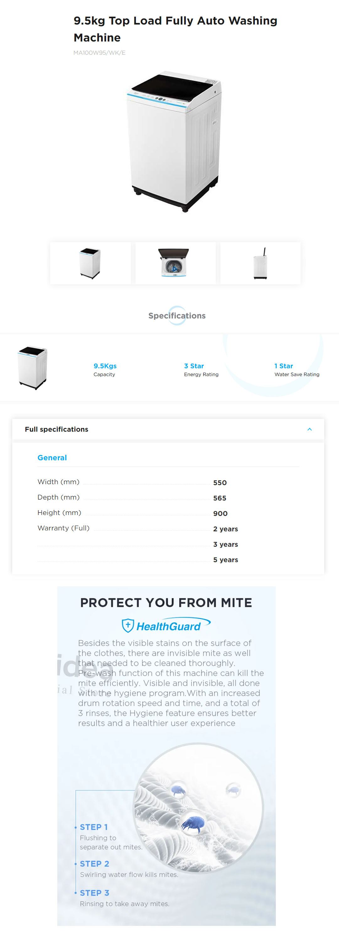 Midea 9.5KG Top Load Washing Machine MA100W95/WK/E | Lunar Dial | Pulsator | 15' Quick Wash | One-Touch Smart Wash | Auto Clean | Easy-To-Clean Metal Lint Filter | Water Cub Tub | Washing Machine with 2 Year Warranty