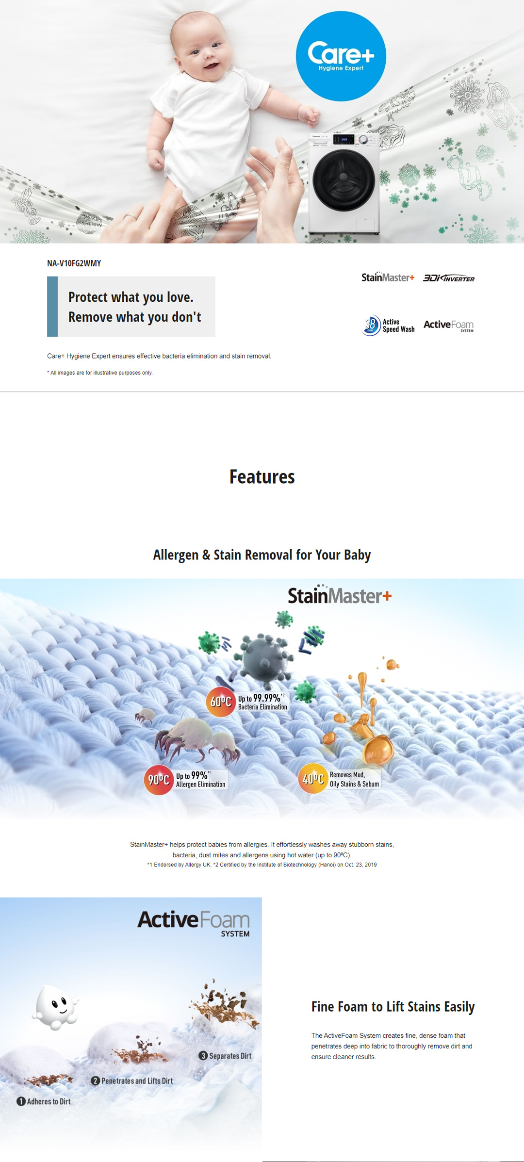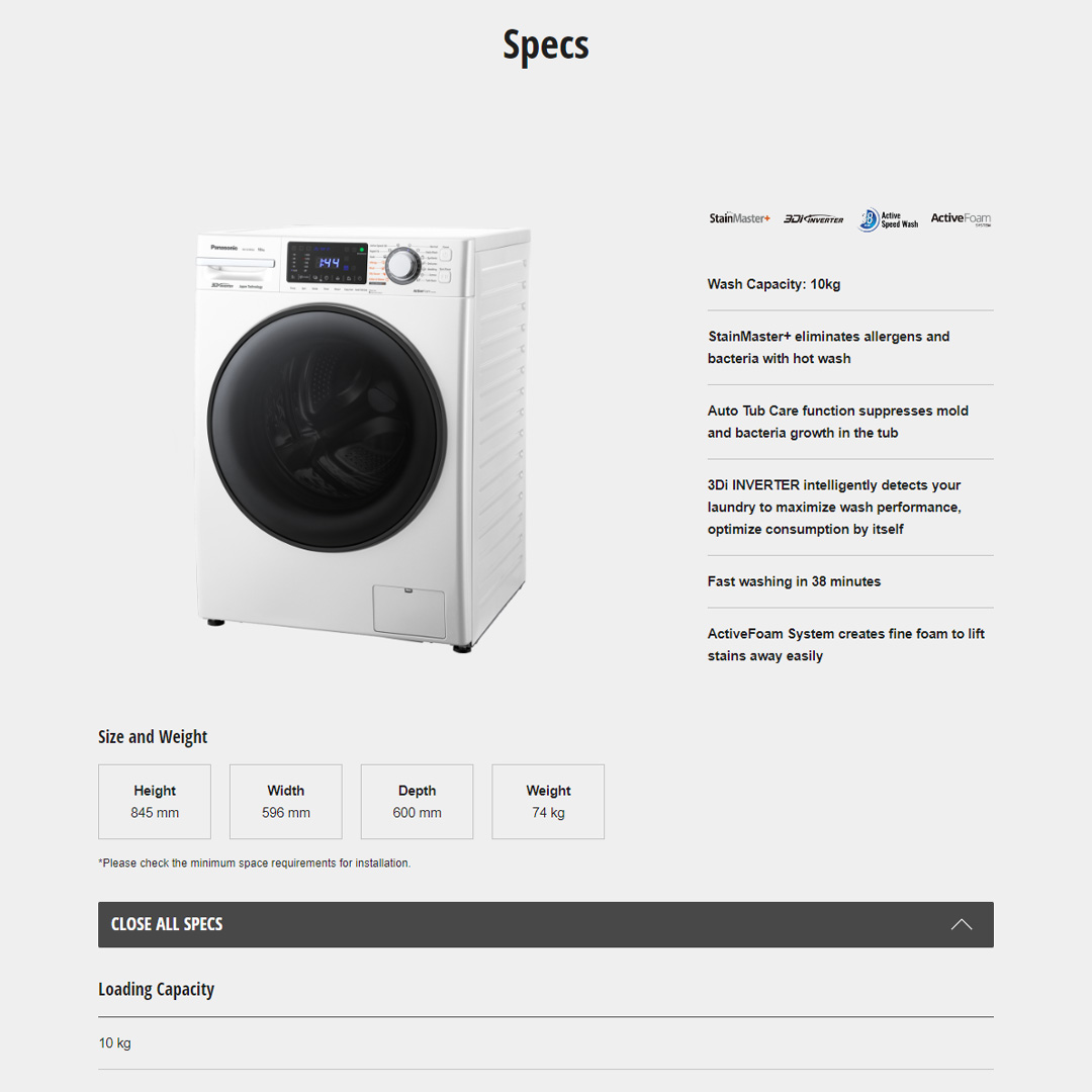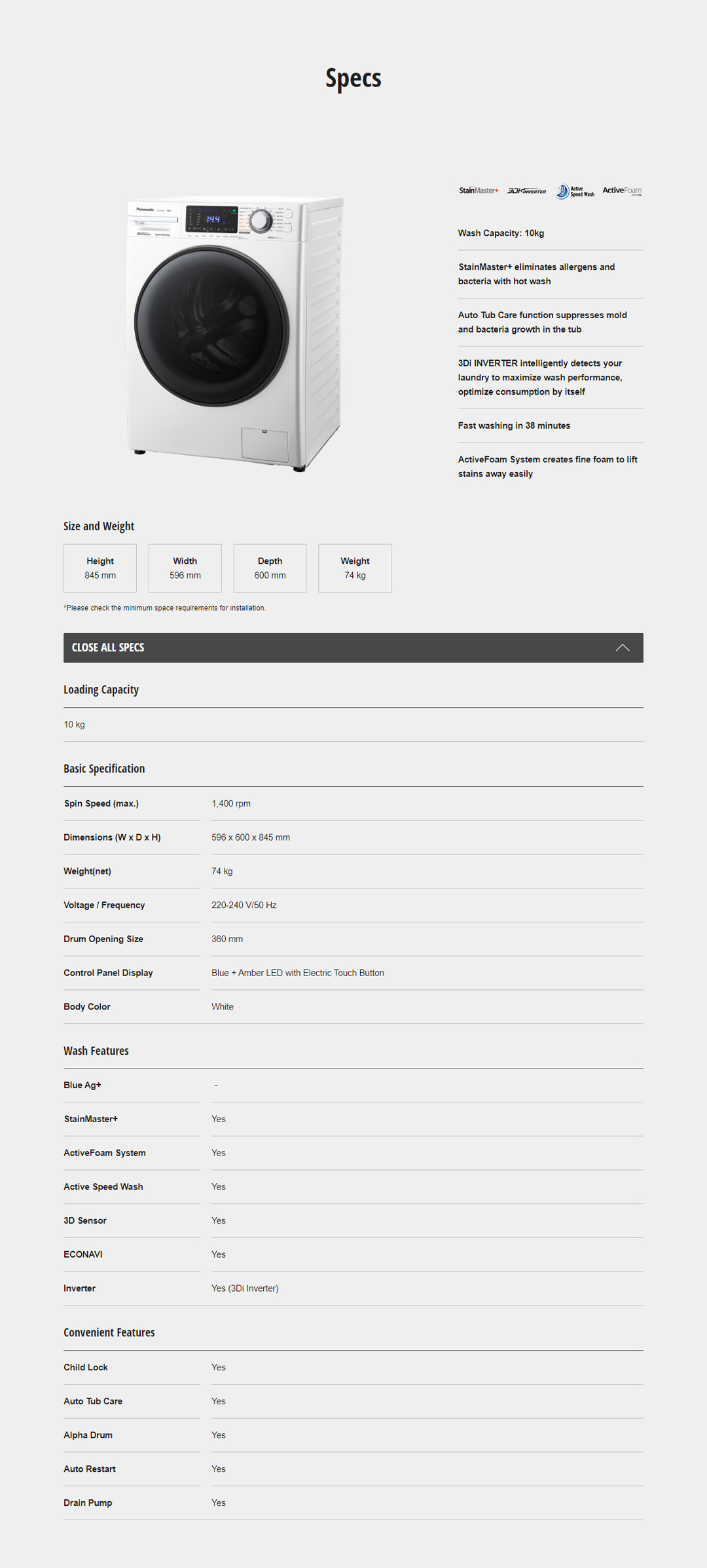 Panasonic 10KG Front Load ECONAVI Inverter Washing Machine NA-V10FG2WMY | Active Speed Wash | 3D Sensor | Auto Restart | Child Lock | Daily Wash | Washing Machines with 1 Year Warranty