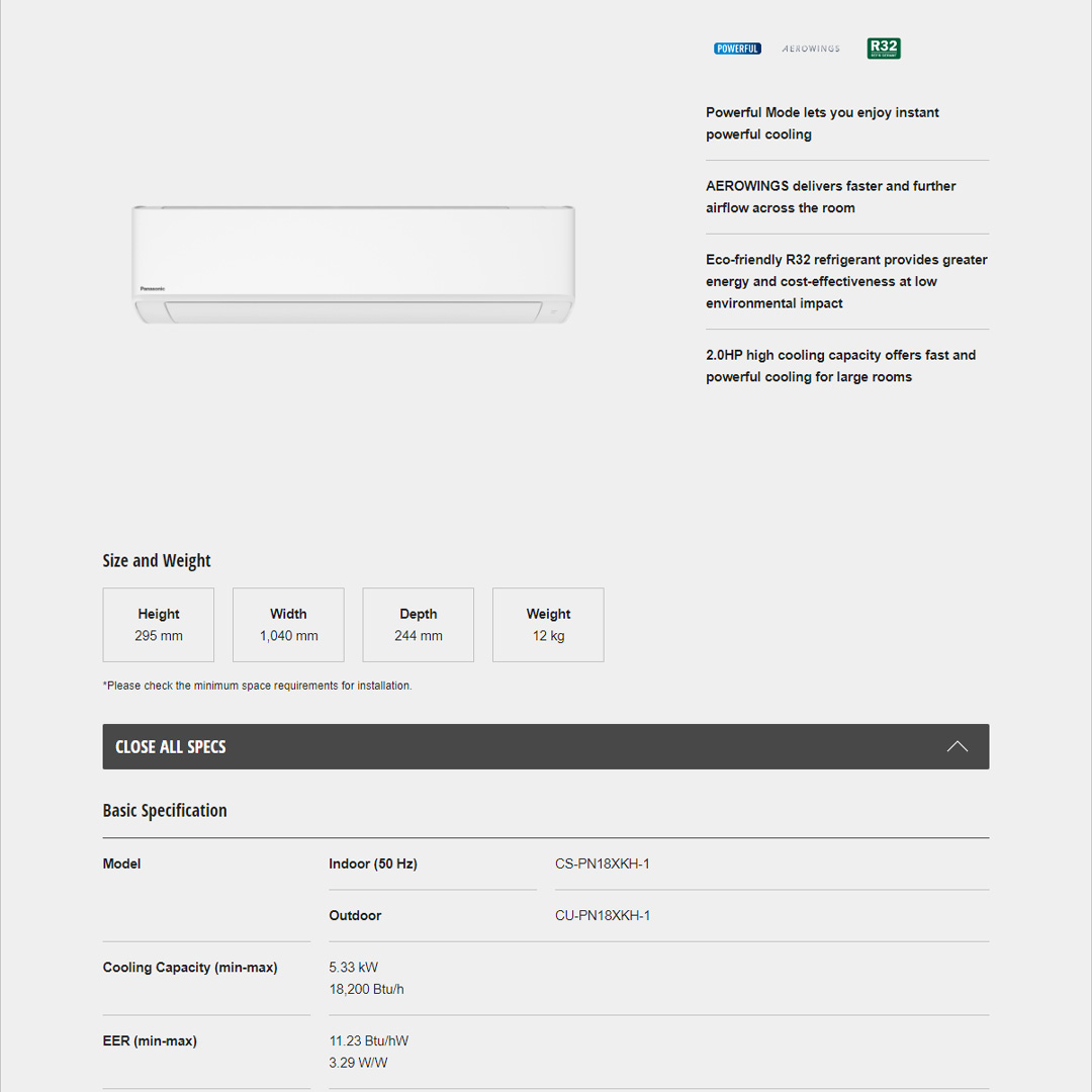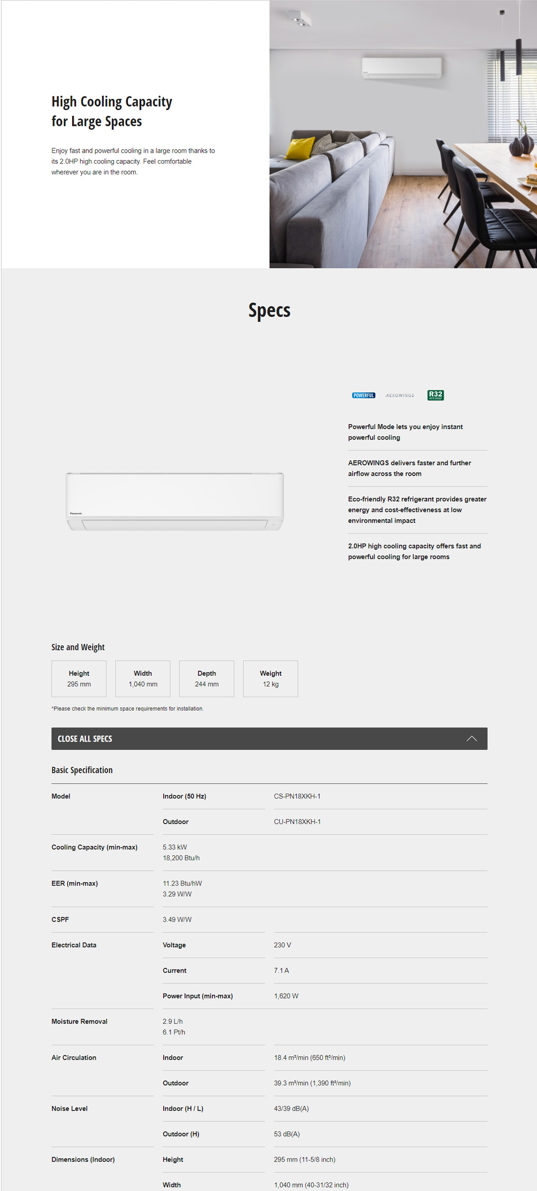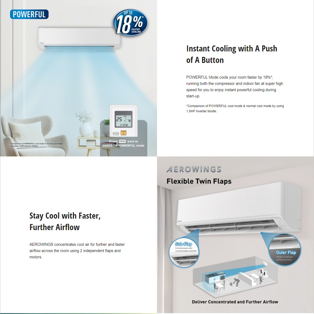 Panasonic 2HP R32 Wall Mount Non-Inverter Air Conditioner CS-PN18XKH-1B / CU-PN18XKH-1 | Sleep Mode | Powerful Mood | Quiet Mode | LCD Wireless Remote Control | Air Conditioner with 1 Year Warranty