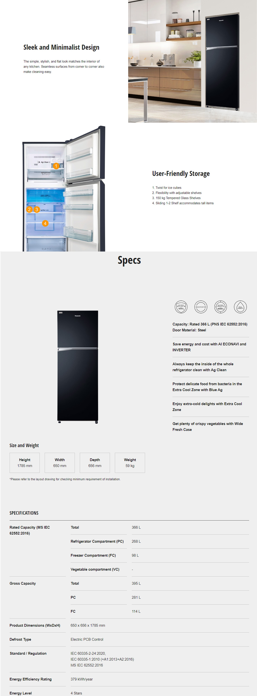 Panasonic 395L 2 Doors Top Mount Inverter Refrigerator with AI ECONAVI NR-TL381BPKM | Hygienic Storage With Blue Ag | Clean Air Surrounds Your Food | Enjoy The Extra-Cold Delight | Freshness Storage With Wide Opening | Refrigerator With 1 Year Warranty