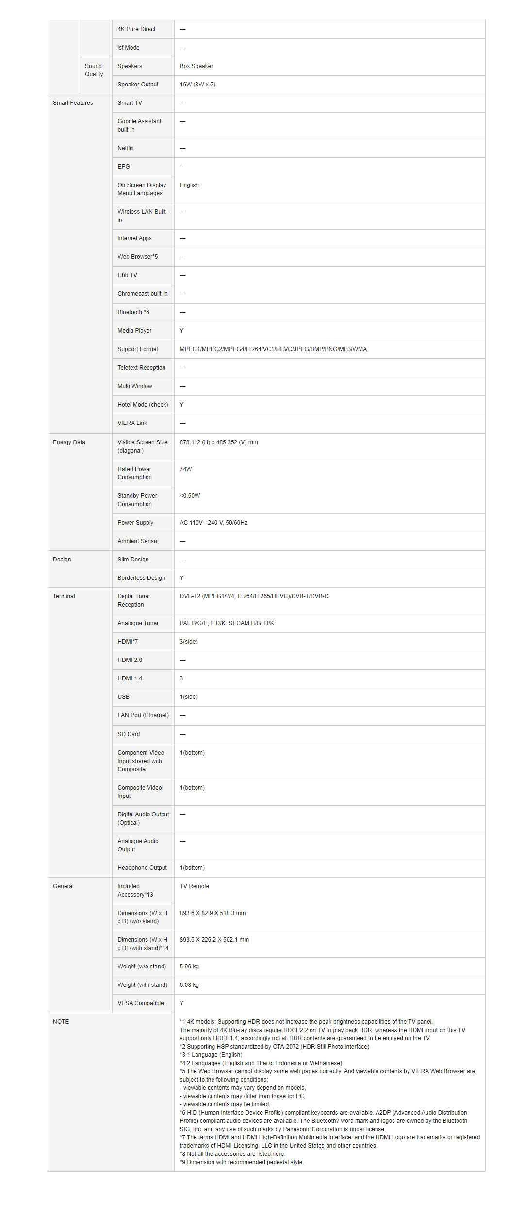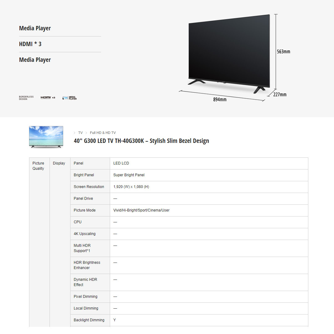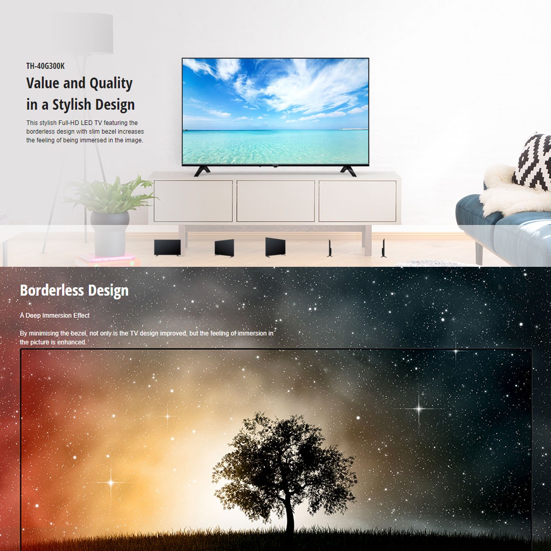 Panasonic 40" FHD LED TV TH-40G300K | HDMI | USB | Backlight Dimming | Borderless Design | Media Player | LED TV with 2 Year Warranty