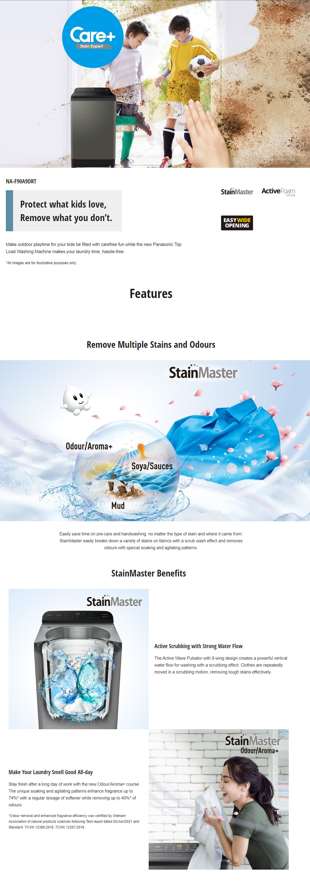 • Active Foam creates fine foam to easily lift stains away