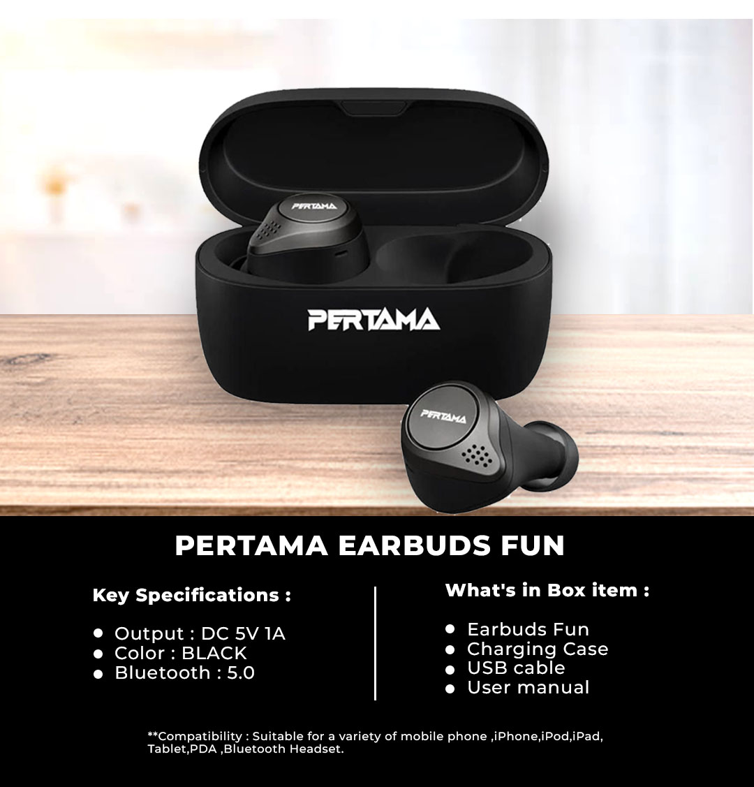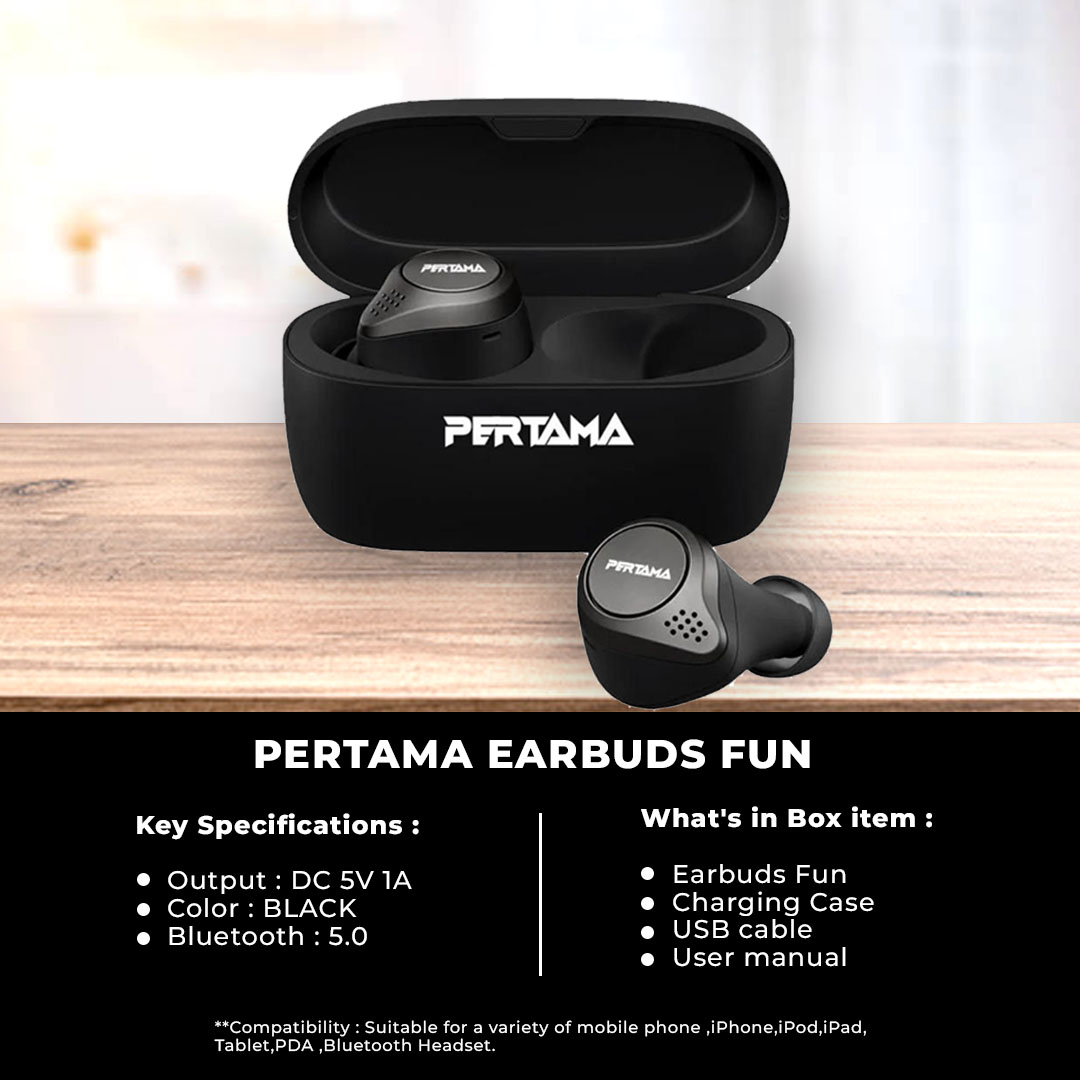 Pertama True Wireless Earbuds Fun PTM-EBF01 | Output : DC 5V 1A | Bluetooth : 5.0 | Earbuds with 3 Months Warranty