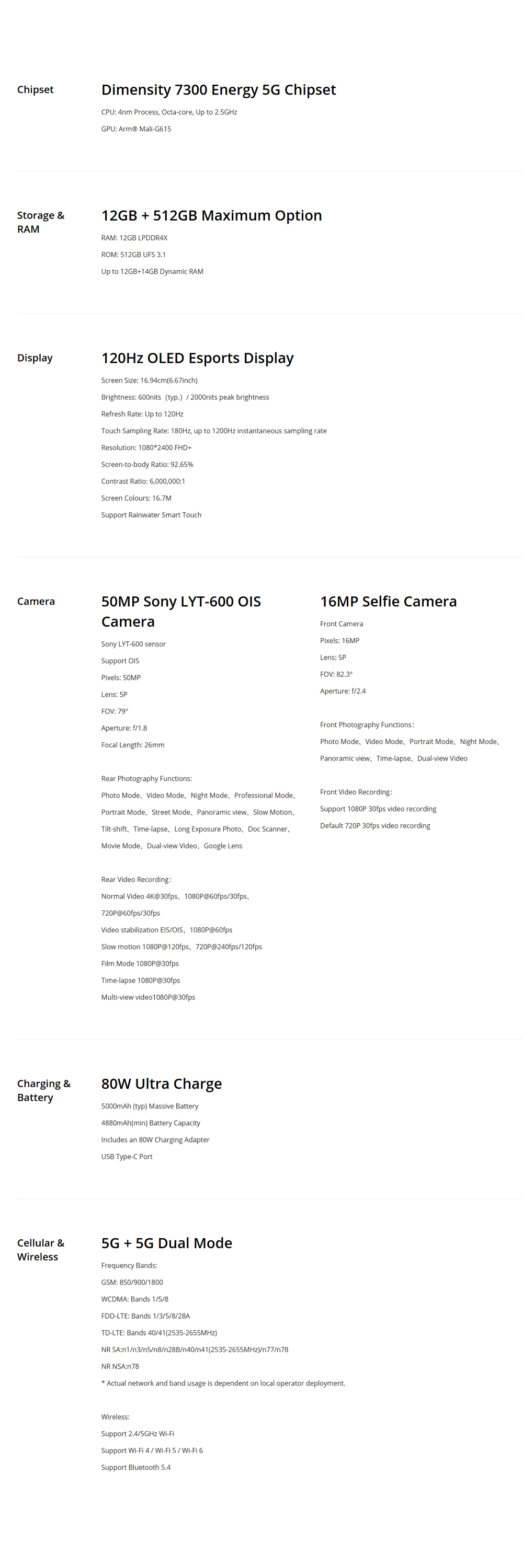 ▪ Battery Capacity(mAh): 5000mAh, 80W Ultra Charge