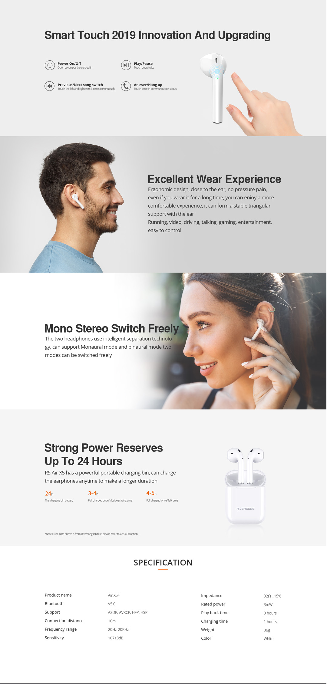 RIVERSONG Air X5+ TWS Earbuds | Bluetooth 5.0 | Smart Touch | 10m Connection Distance | 3-4 Hours Full Charged | Earbud with 1 Year Warranty