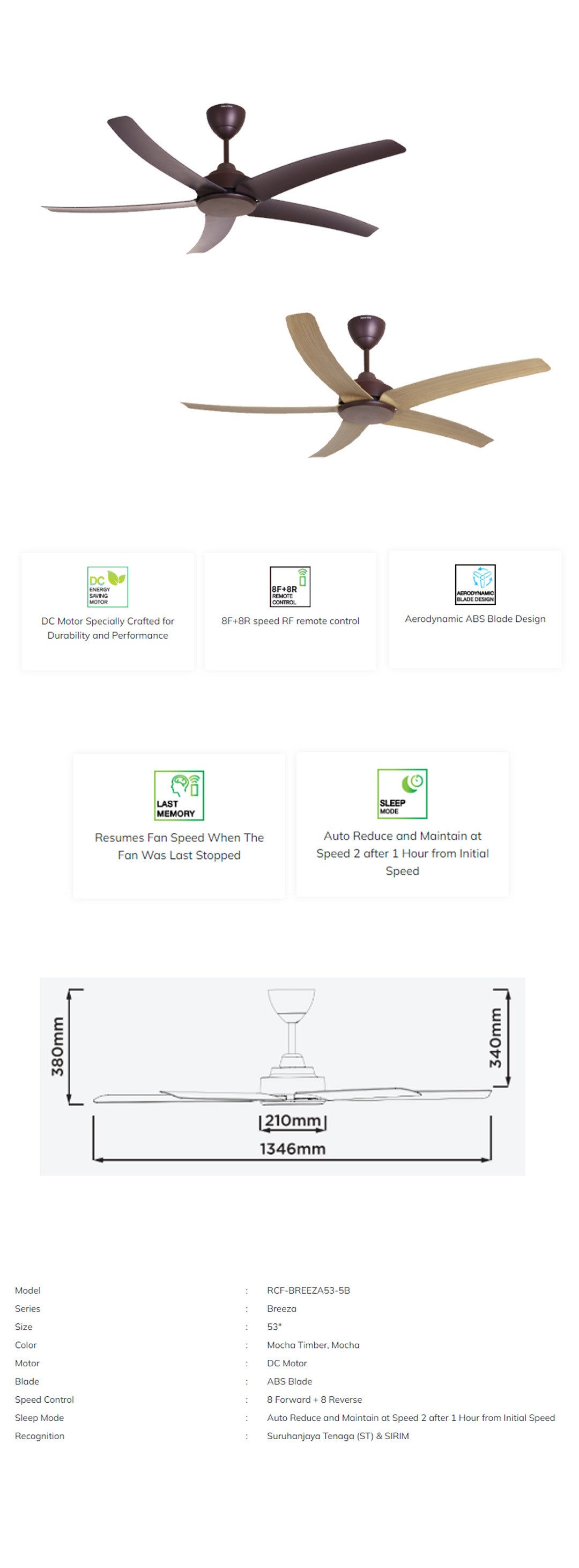 Rubine 53" 5 Blades DC Motor Ceiling Fan | RCF-BREEZA53-5B-MO / RCF-BREEZA53-5B-MT | 8F+8R Speed RF Remote Control | Turbo Speed | Ceiling Fan with 1 Year Warranty