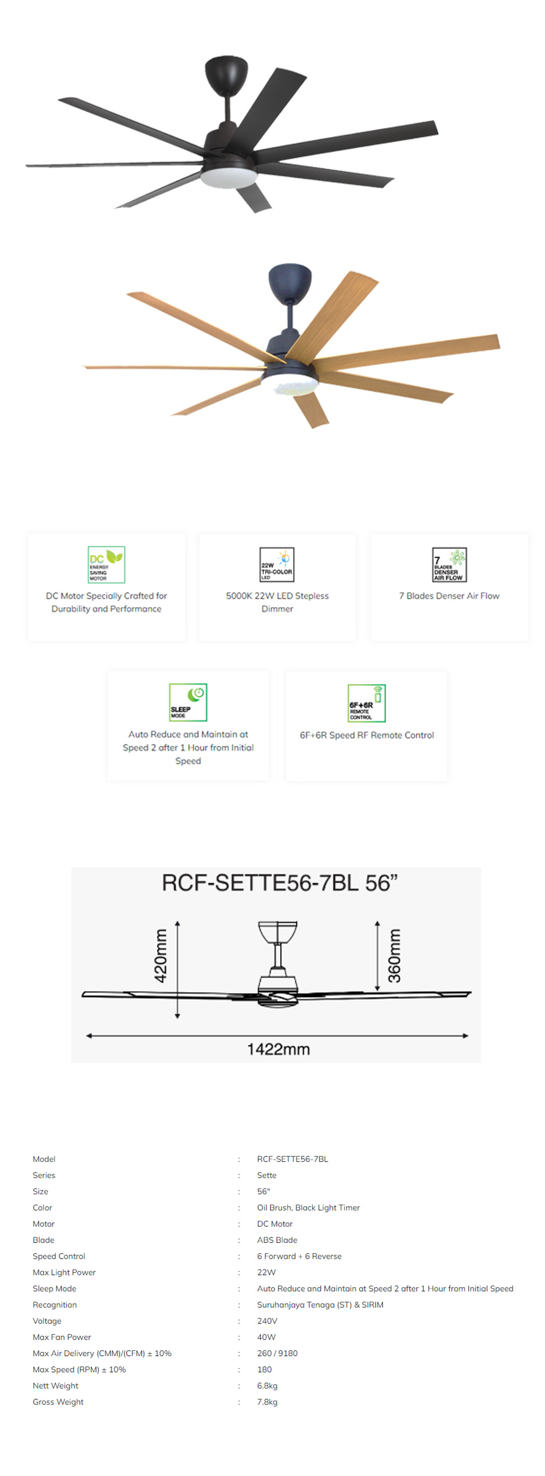 Rubine 56" 7 Blades DC Motor Ceiling Fan | RCF-SETTE56-7BL-BLT / RCF-SETTE56-7BL-OB | 6F+6R Speed RF Remote Control | 7 Blades Denser Air Flow | 22W Tri-Color LED | Ceiling Fan with 1 Year Warranty