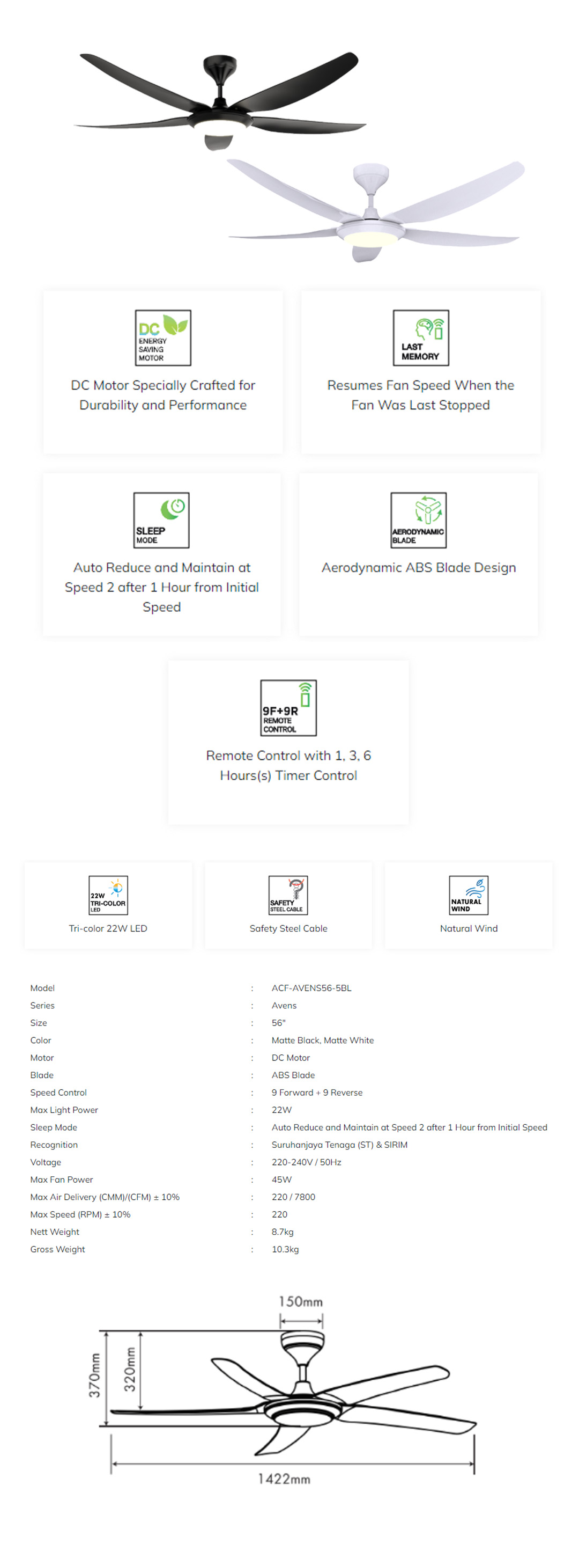 Rubine 56" Avens Series 5 Blades DC Motor Ceiling Fan with LED ACF-AVENS56-5BL-MB | 9F+9R Speed RF Remote Control | Sleep Mode | Ceiling Fan with 1 Year Warranty
