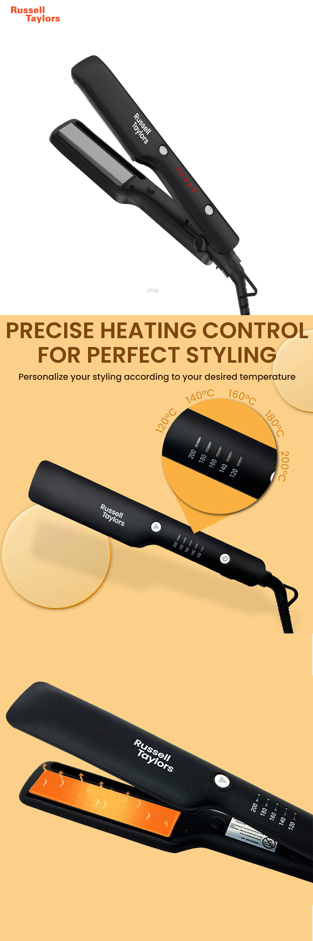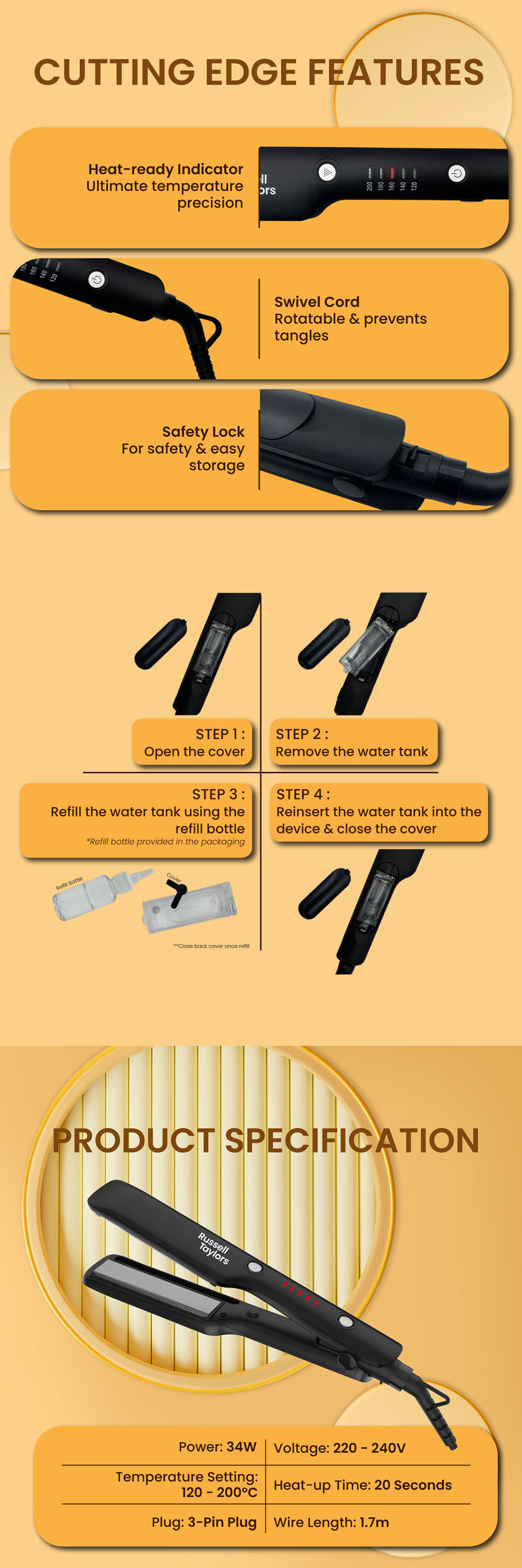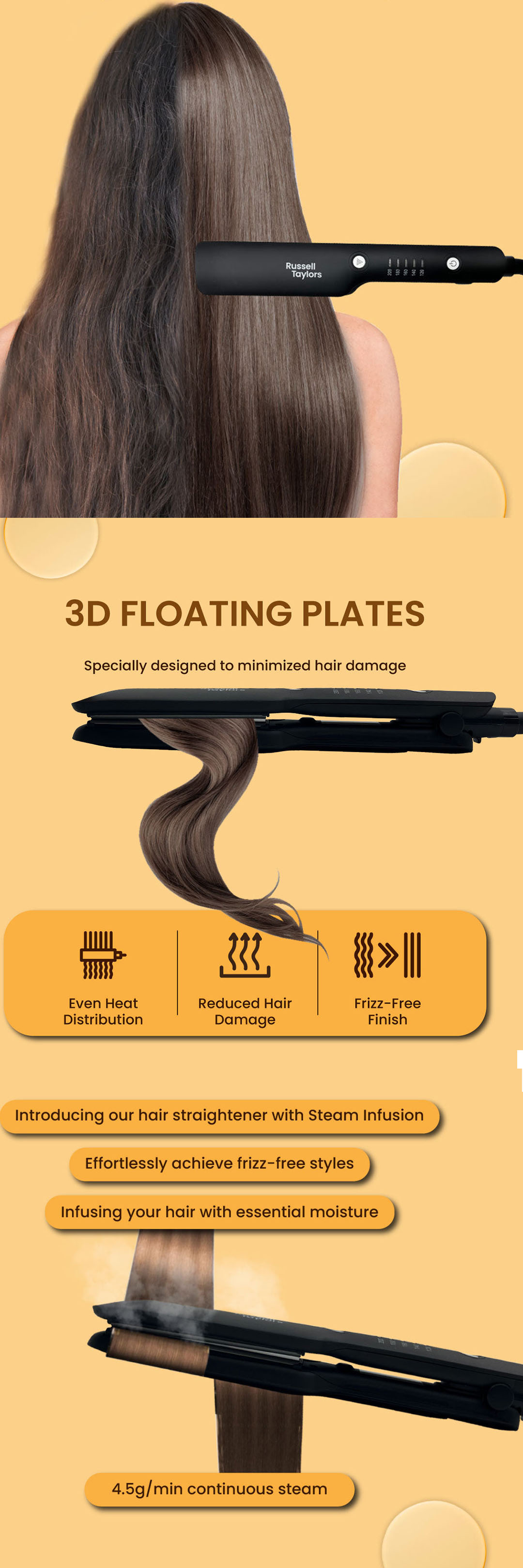 Russell Taylors 34W Ceramic Coating Hair Straightener with Steam Infusion HS2 | 20ml Water Tank | Cutting Edge Features | Hair Straightener with 2 Year Warranty