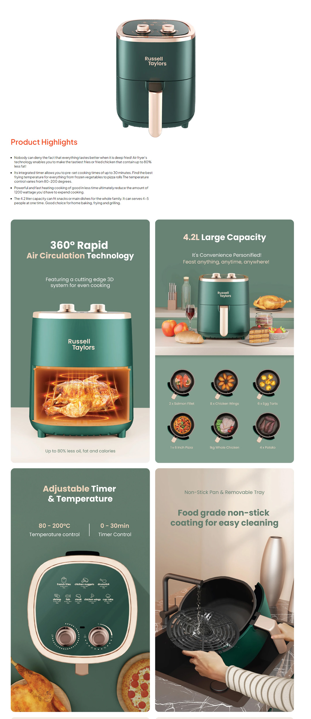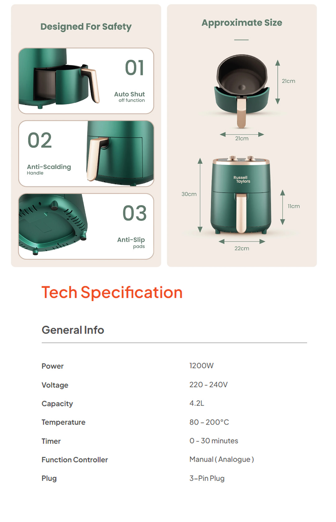 Russell Taylors 4.2L 3D Air Fryer Z1 | 360° Rapid Air Circulation Technology | Non Stick Pan | Temperature 80-200ºC | Mechanical Control | Auto Shut Off | Power: 1,200W | Air Fryer with 2 Year Warranty