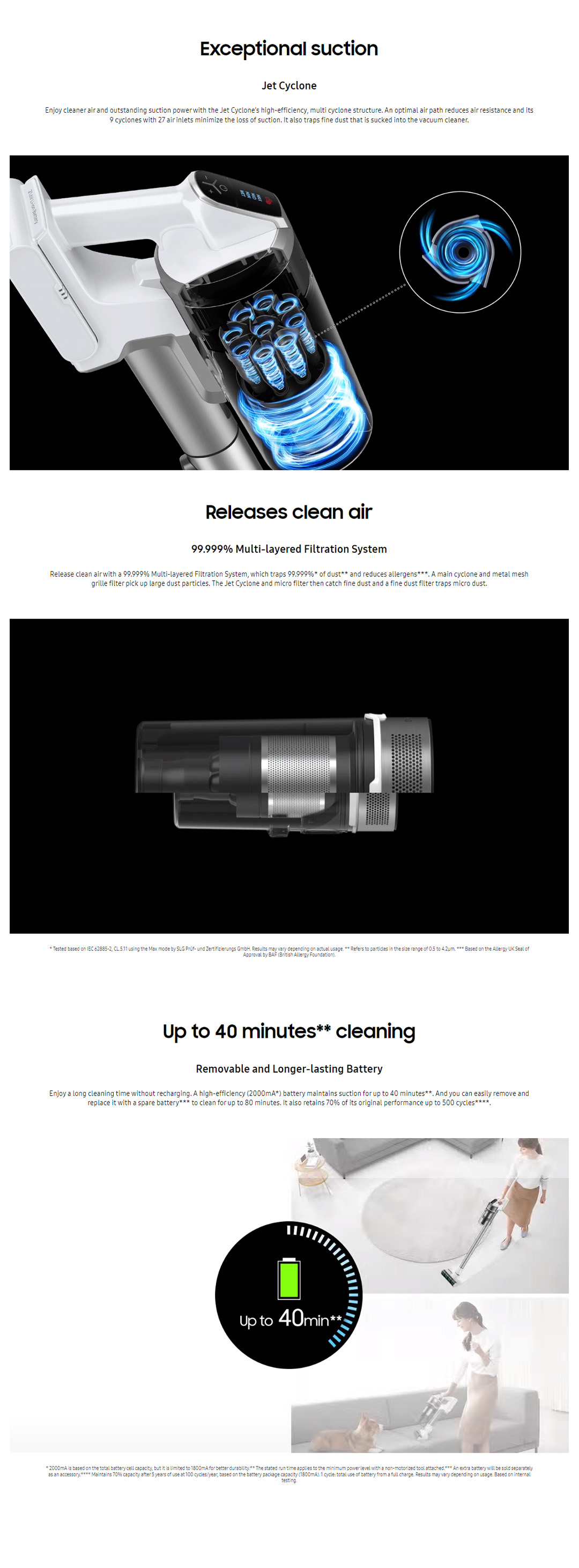 · Jet Cyclone: New advance technology with extreme suction power up to 150W.