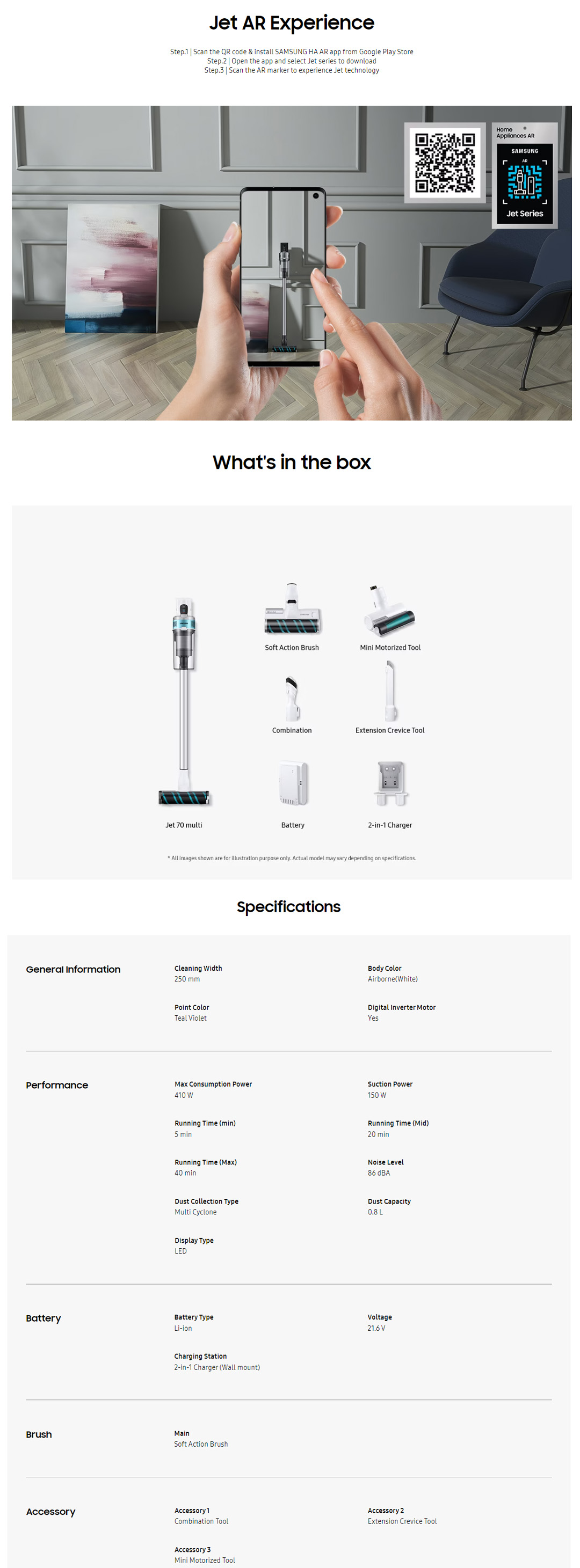 SAMSUNG 410W Jet 70 Multi Vacuum Cleaner Stick VS15T7034R4/ME | Jet Cyclone | 2-in-1 Charging Station | 99.999% Multi-layered Filtration System | Vacuum with 1 Year Warranty