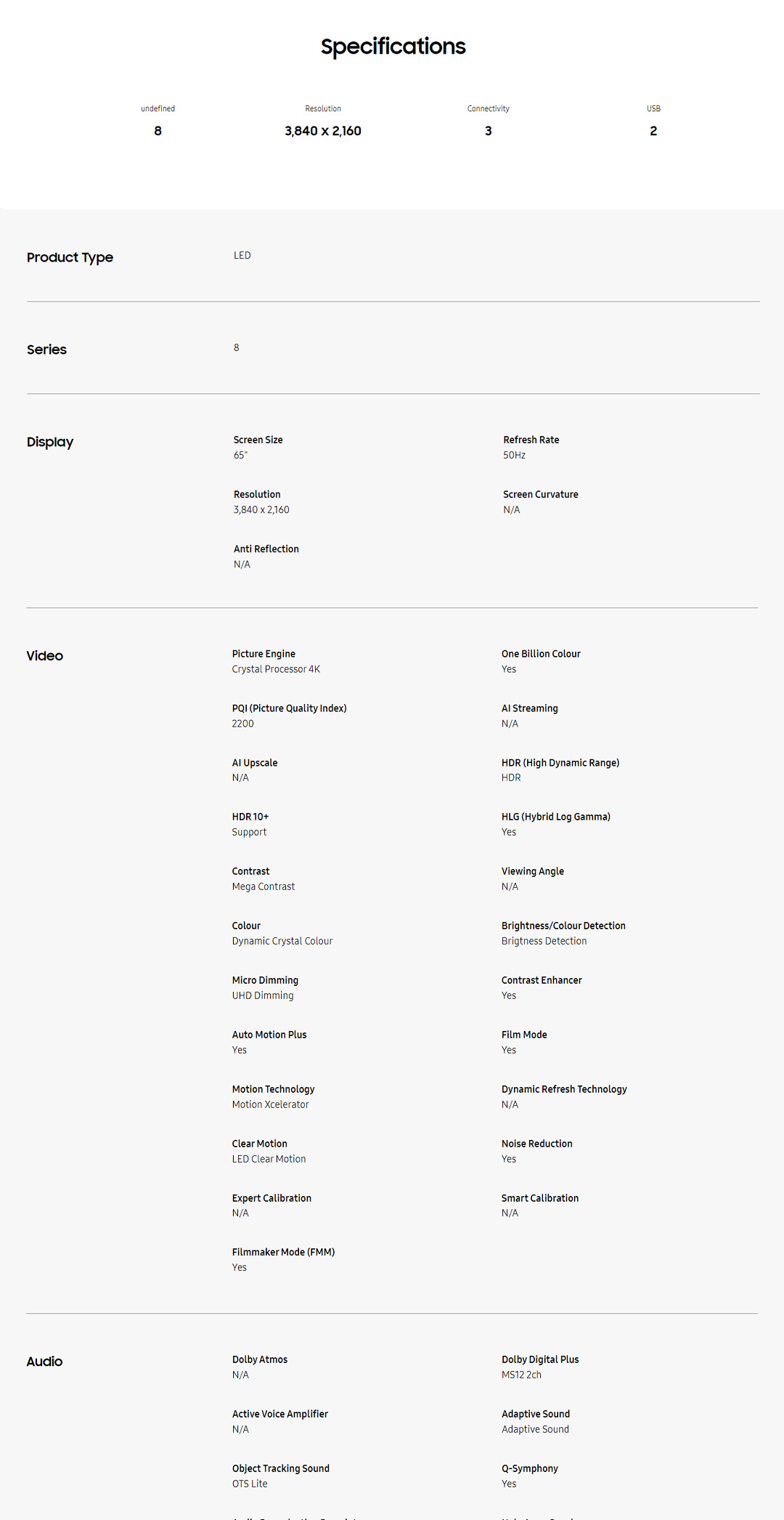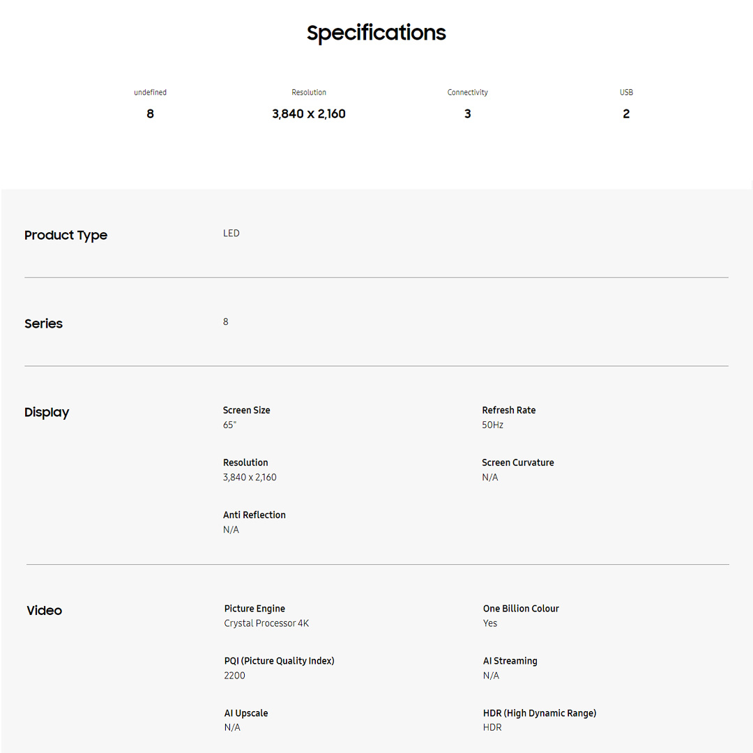 SAMSUNG 65" 4K Crystal UHD Smart LED TV UA65BU8500KXXM | USB | HDMI | Eco Sensor | HDR 10+ | Q-Symphony | Bluetooth | SmartThings | Web Browser | Microsoft 365 | Ethernet LAN | Digital Audio Out | Smart TV with 2 Year Warranty