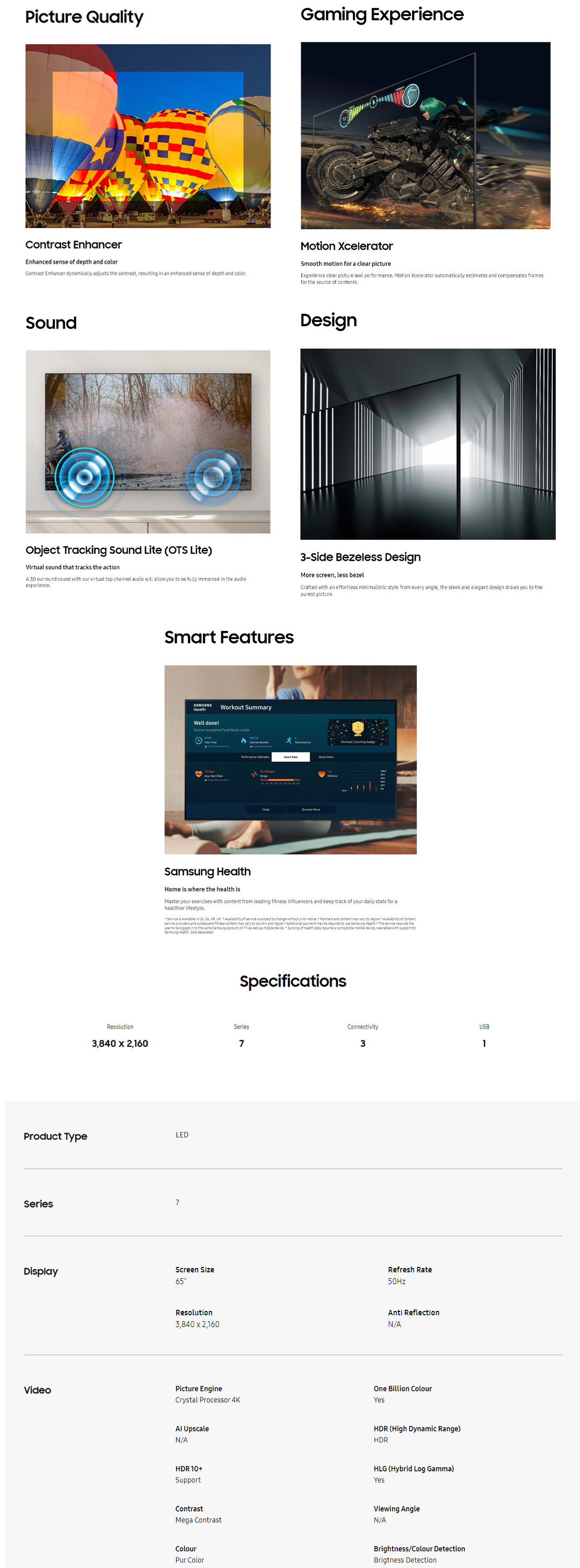 SAMSUNG 65" Crystal 4K UHD Smart TV UA65CU7000KXXM | Motion Xcelerator | Samsung Health | Q-Symphony | Smart Hub | Crystal Processor 4K | Smart TV with 2 Year Warranty