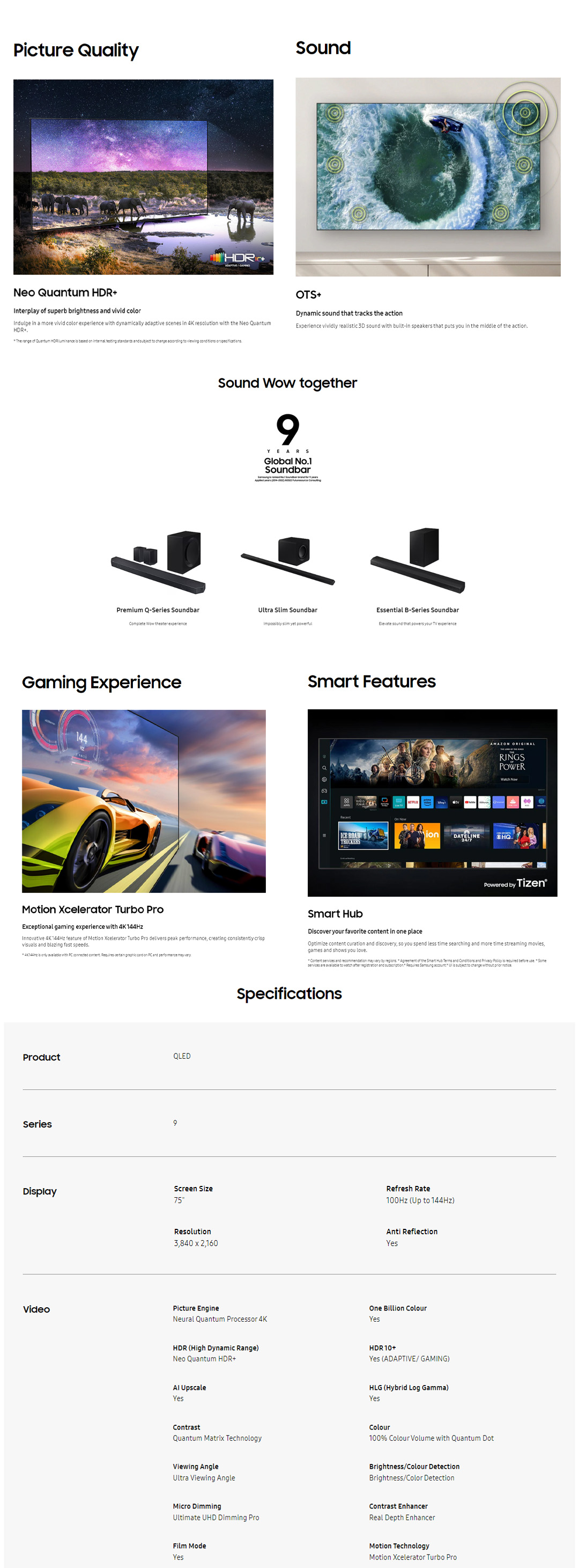 SAMSUNG 75" 4K UHD Smart NEO QLED TV QA75QN95CAKXXM | Infinity One Design | Dolby Atmos | Smart Hub | SmartThings | HDR | HDMI | Smart TV with 2 Year Warranty