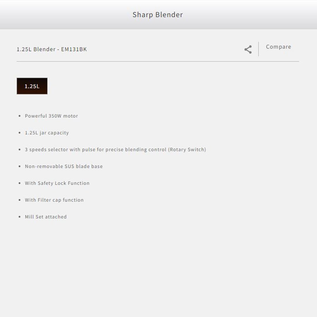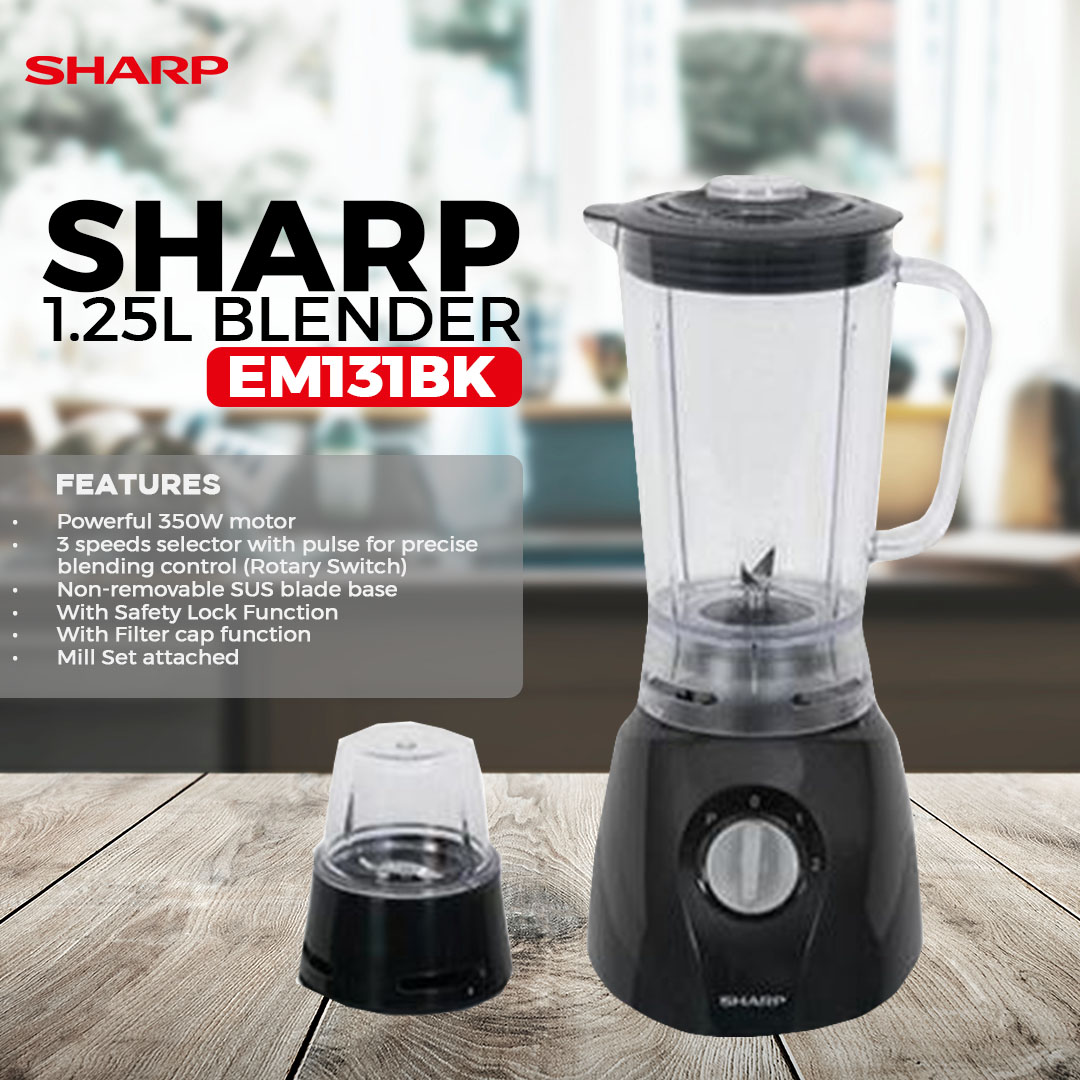 SHARP 1.25L Blender EM131BK | Powerful 350W Motor | 1.25L Jar Capacity | Non-removable SUS Blade Base | With Safety Lock Function | With Filter Cap Function | Mill Set Attached | Blender with 1 Year General Warranty