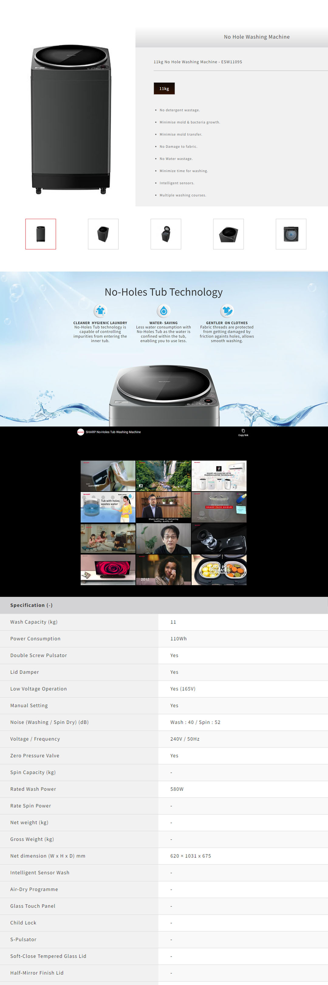 Sharp 11KG Top Load No Hole Washing Machine ESW1109S | Auto Restart | Air Dry | LED Digit | Auto Tub Clean | AG Pulsator | Zero Pressure Valve | Lid Damper | Washing Machine with 2 Year Warranty