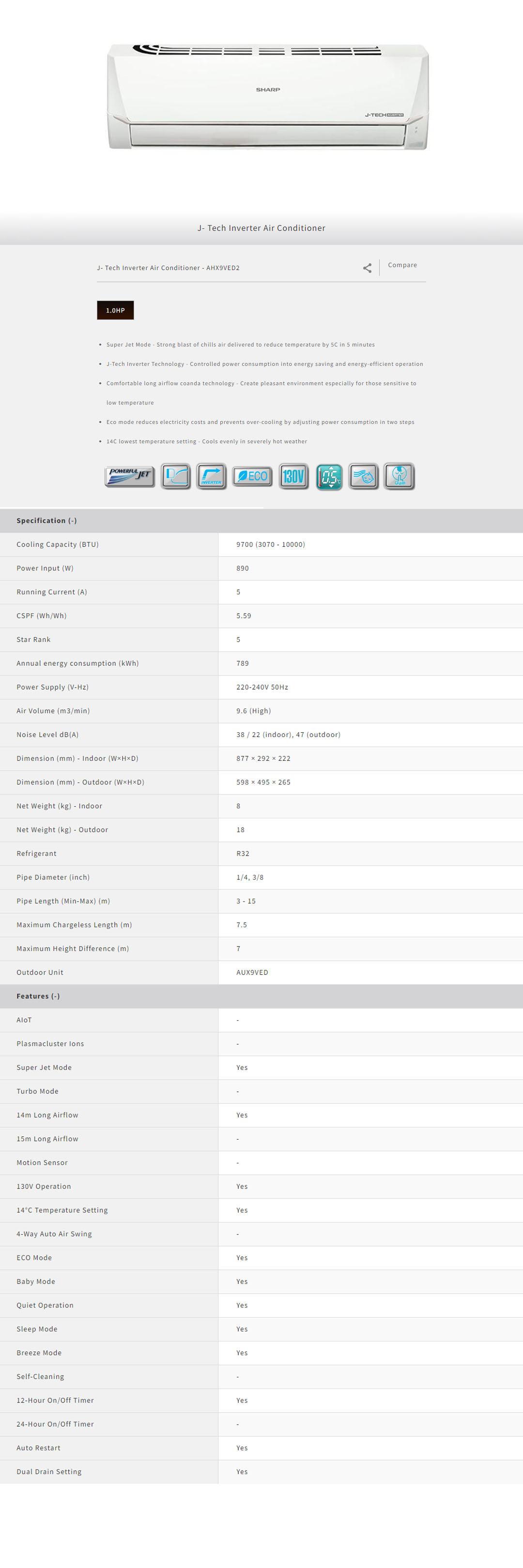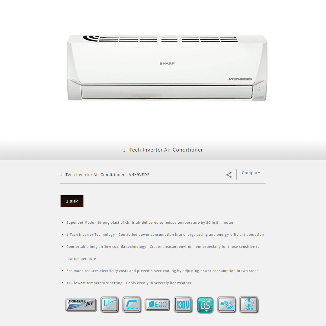 SHARP 1HP R32 J- Tech Inverter Wall Mount Air Conditioner AHX9VED2 & AUX9VED2 | Eco Mode | Powerful Strong Airflow | Energy Saving & Energy-Efficient Operation | 1 Year General and 5 Years Compressor Warranty