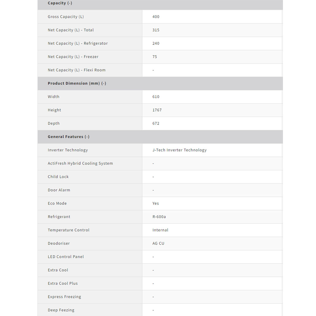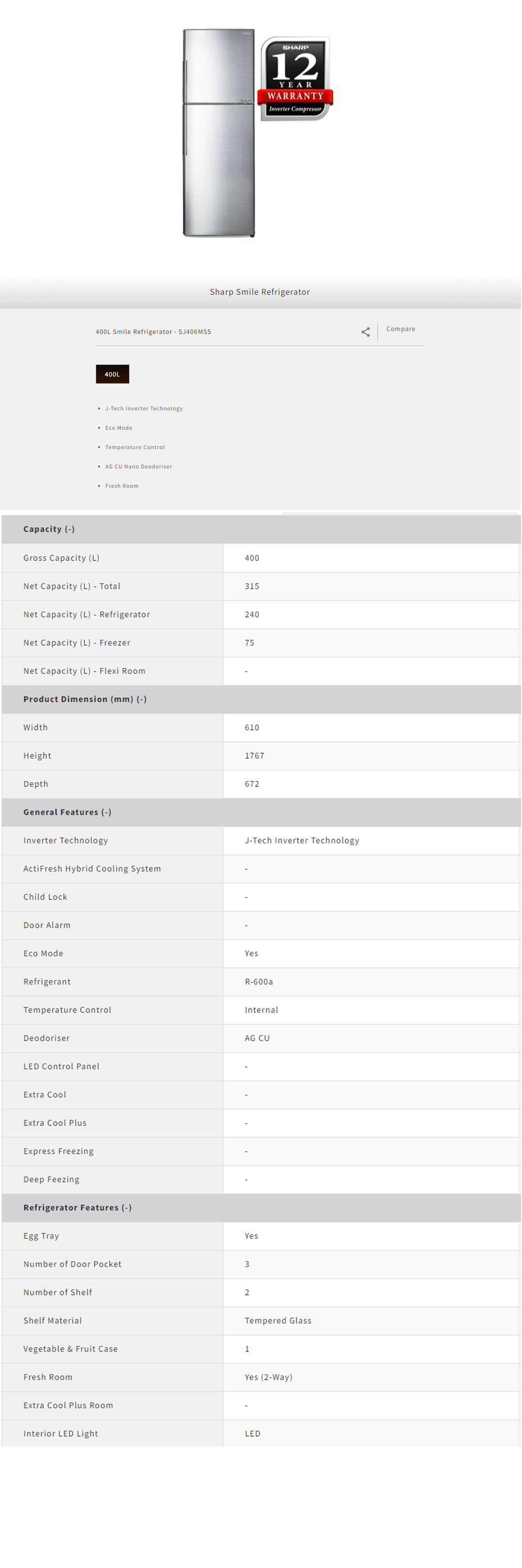 SHARP 400L 2 Door Top Mount Inverter Refrigerator SJ406MSS | J-Tech Inverter Technology | Eco Mode | AG CU Nano Deodorizer | Refrigerator with 1 Year General Warranty & 12 Years Compressor Warranty
