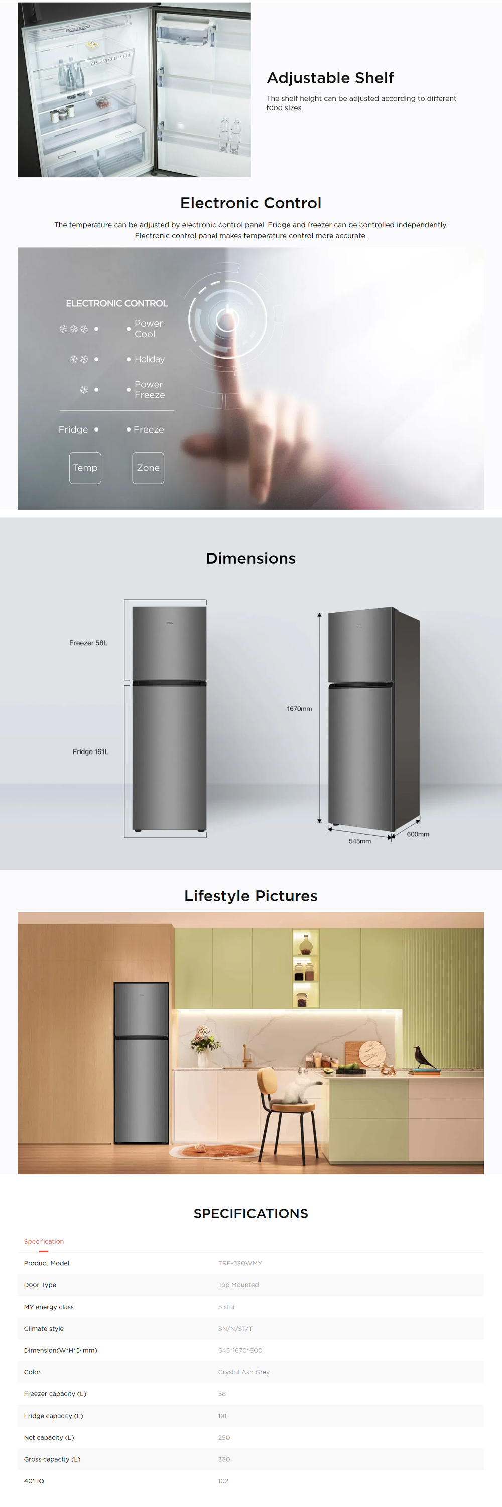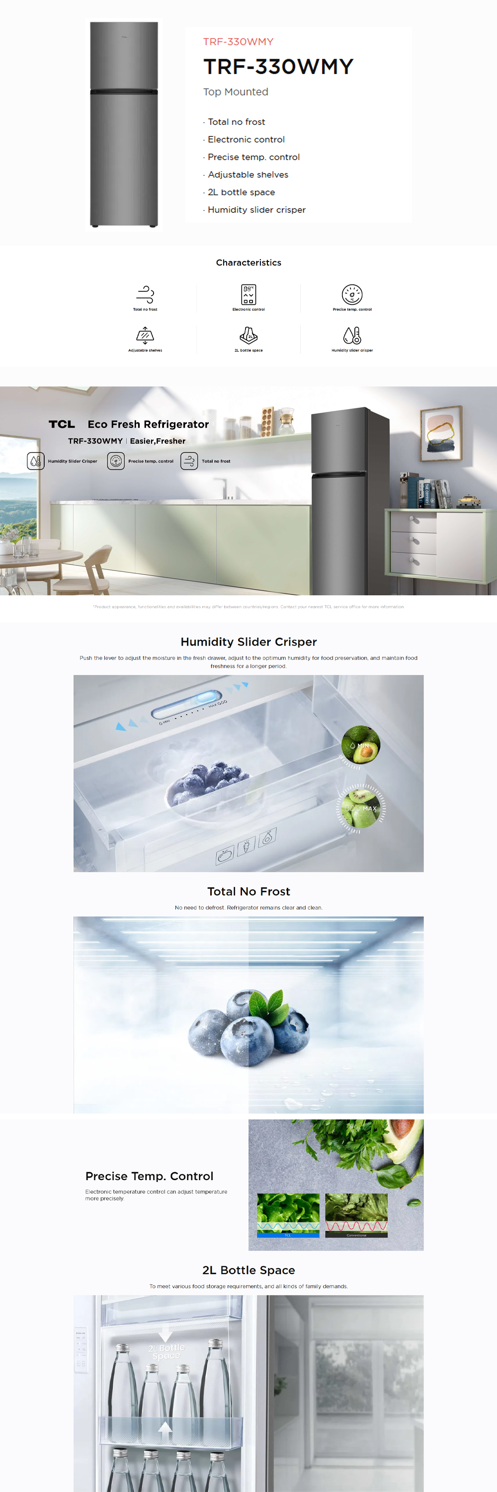 TCL 330L 2 Door Top Mounted Eco Fresh Refrigerator TRF-330WMY | Adjustable shelves | 5 star MY energy class | Humidity slider crisper