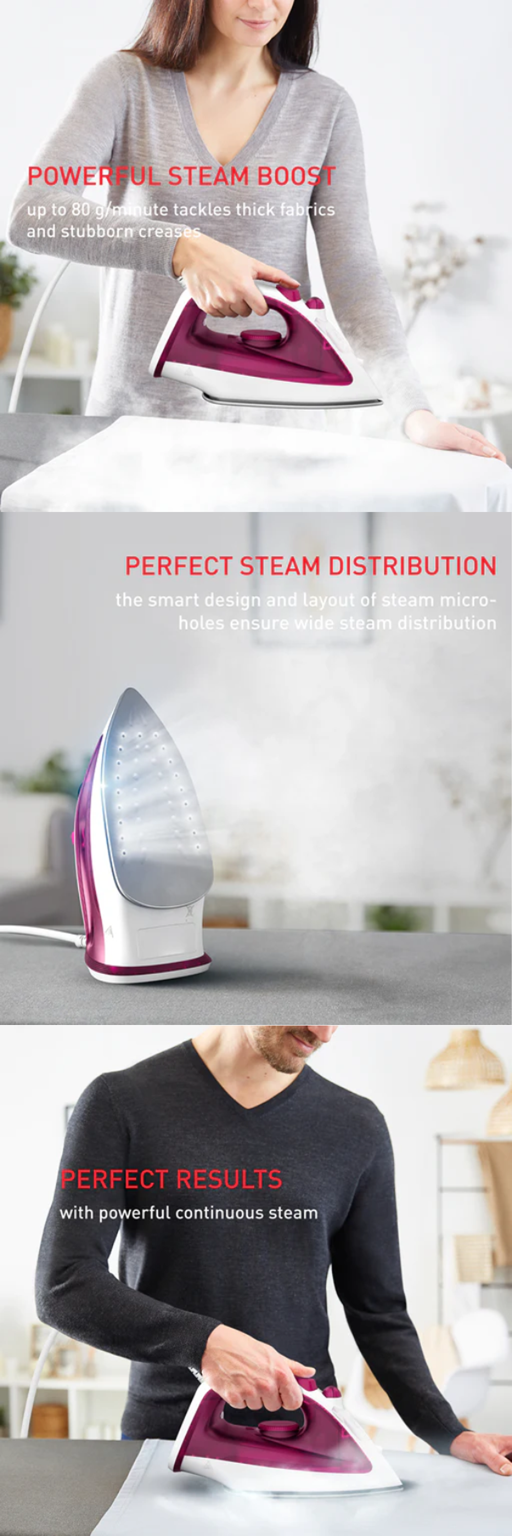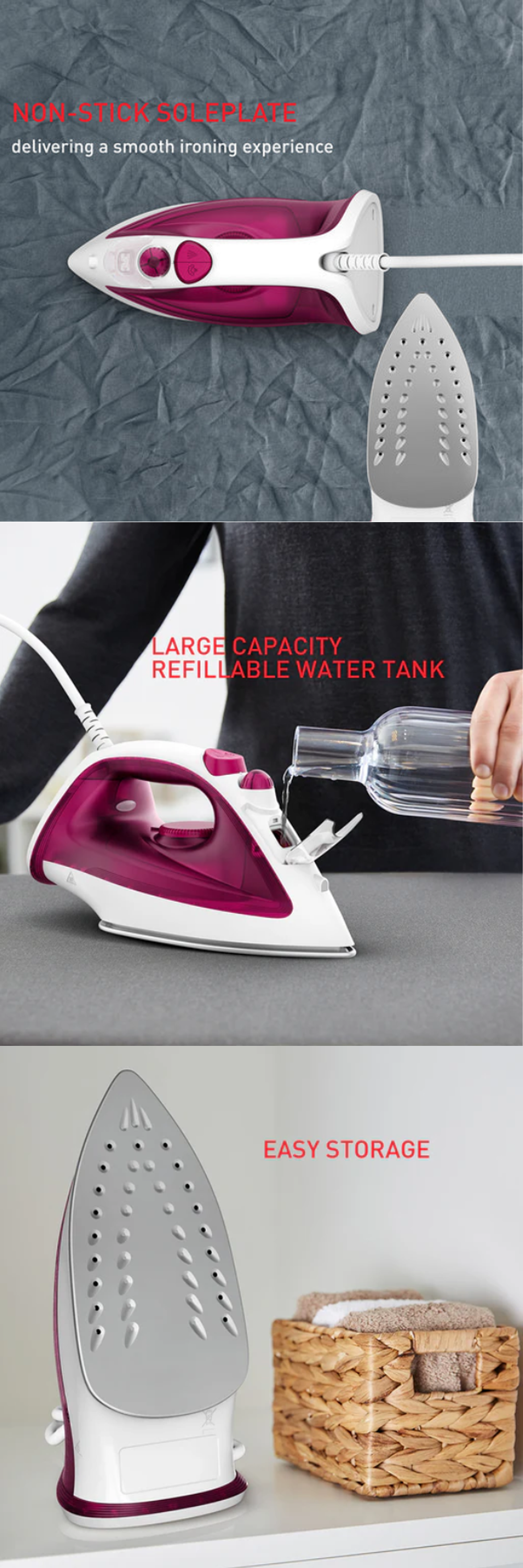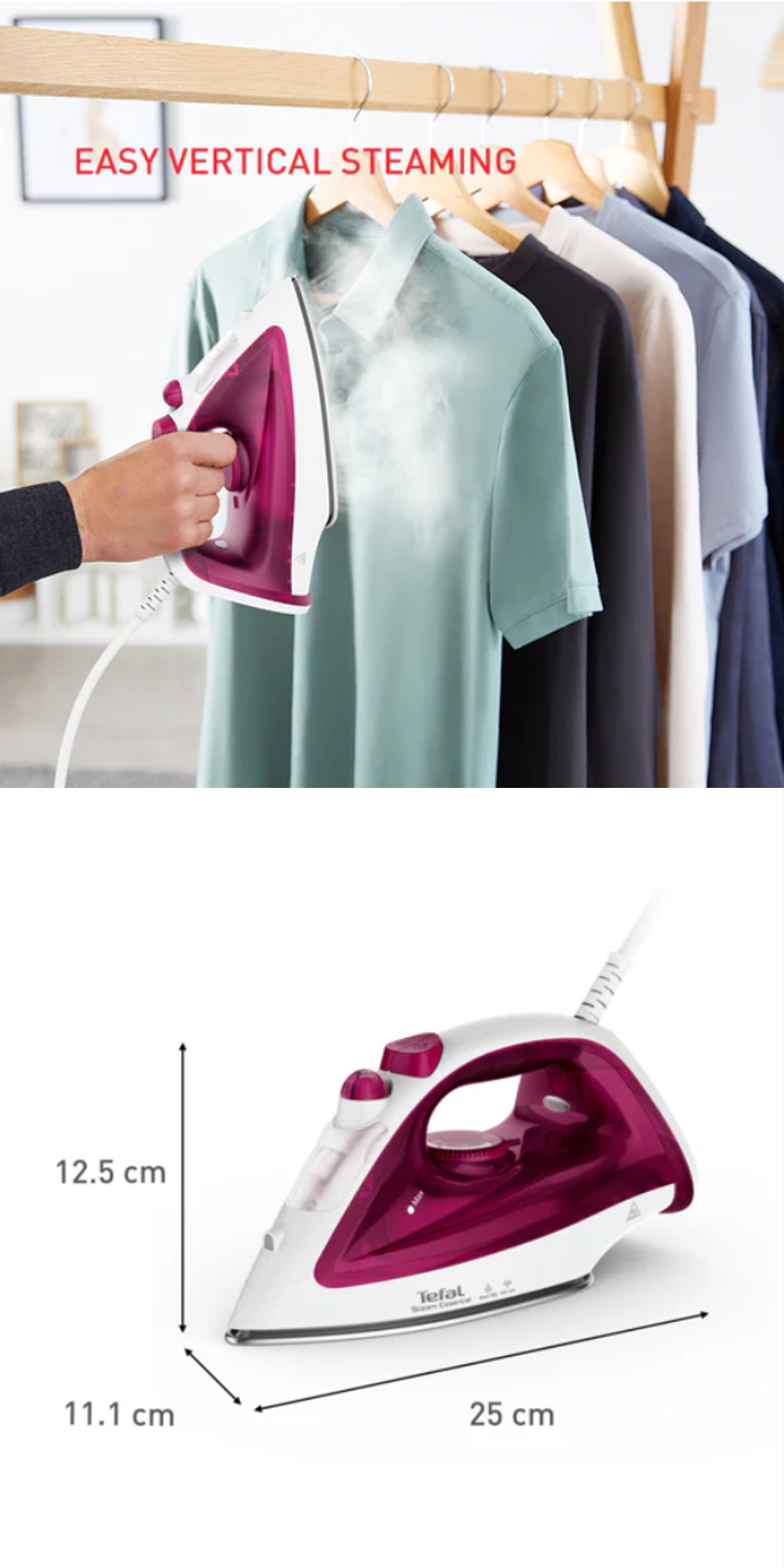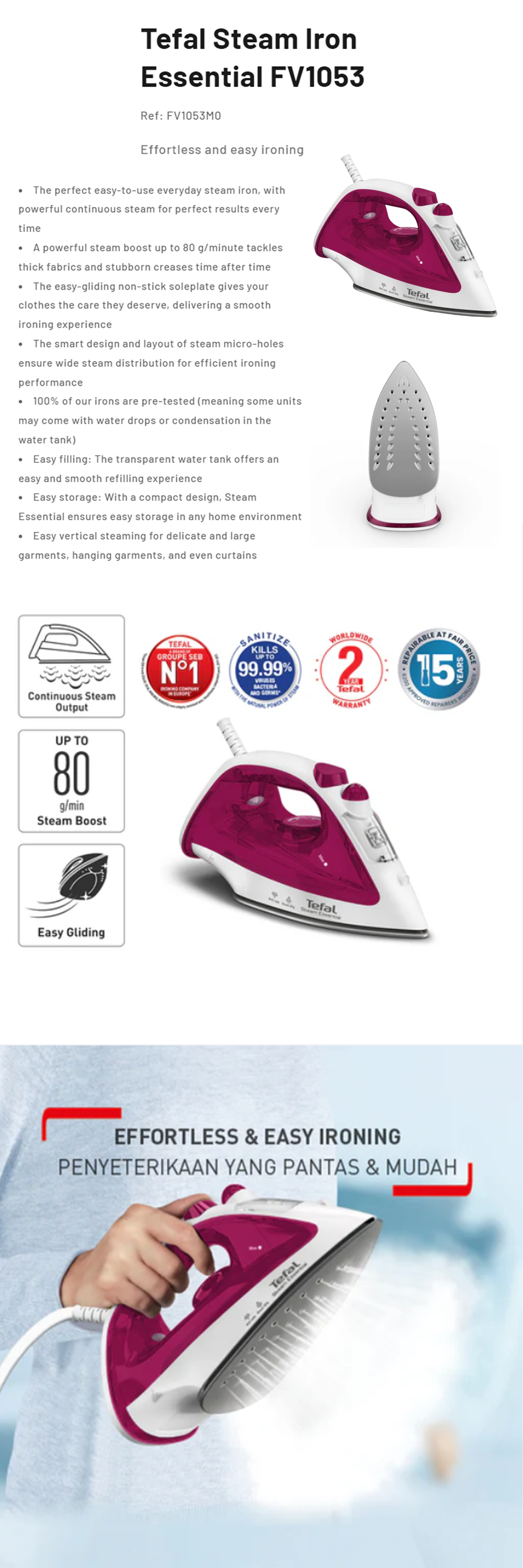 Tefal 1200W Essential Steam Iron FV1053M0 | Continuous Steam Output : 15 Gram/Min | Steam boost : 80 Gram/Min | Vertical Steam : Yes | Spray : Yes