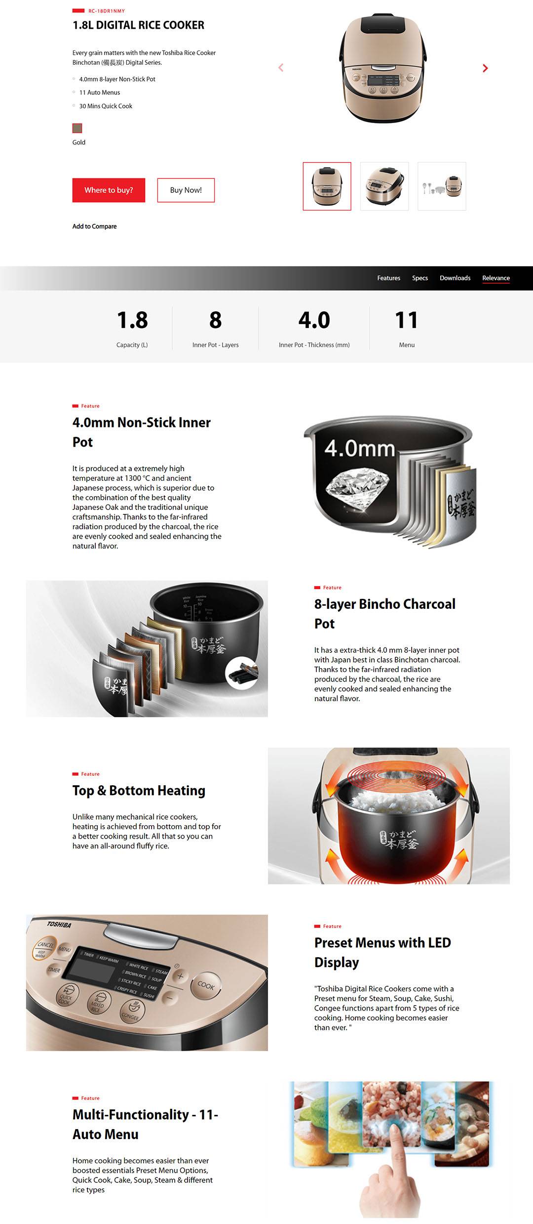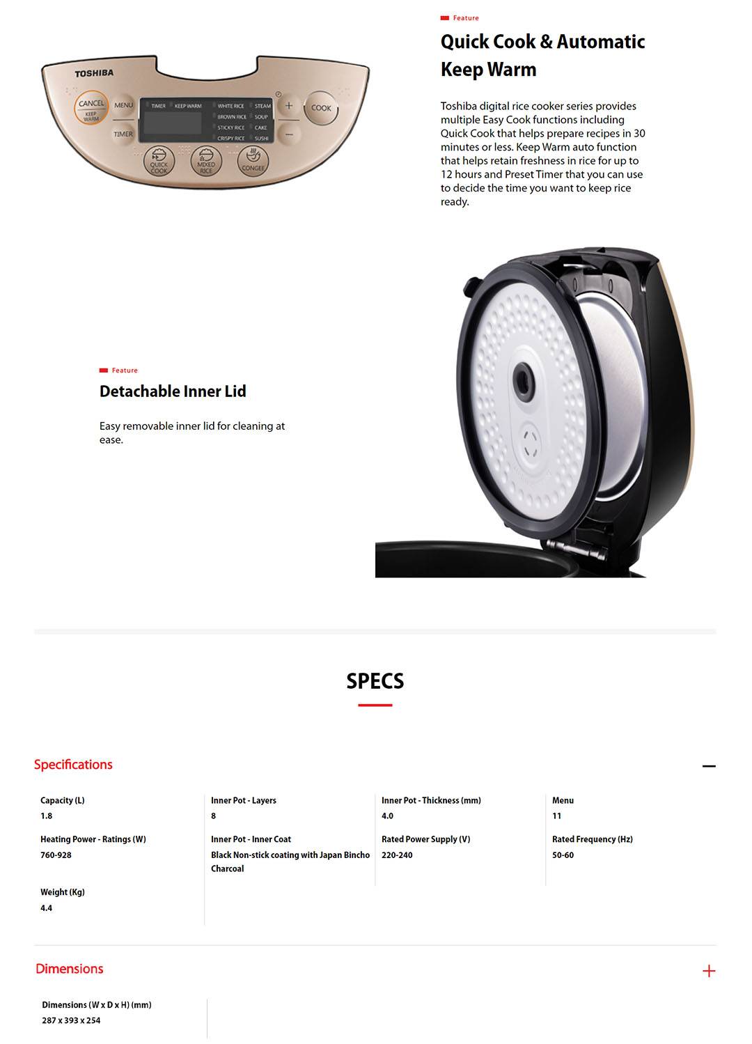 TOSHIBA 1.8L Binchotan Digital Series Digital Rice Cooker RC-18DR1NMY | 8-layer Bincho Charcoal Pot | 11-Auto Menu | Rice Cooker with 1 Year Warranty