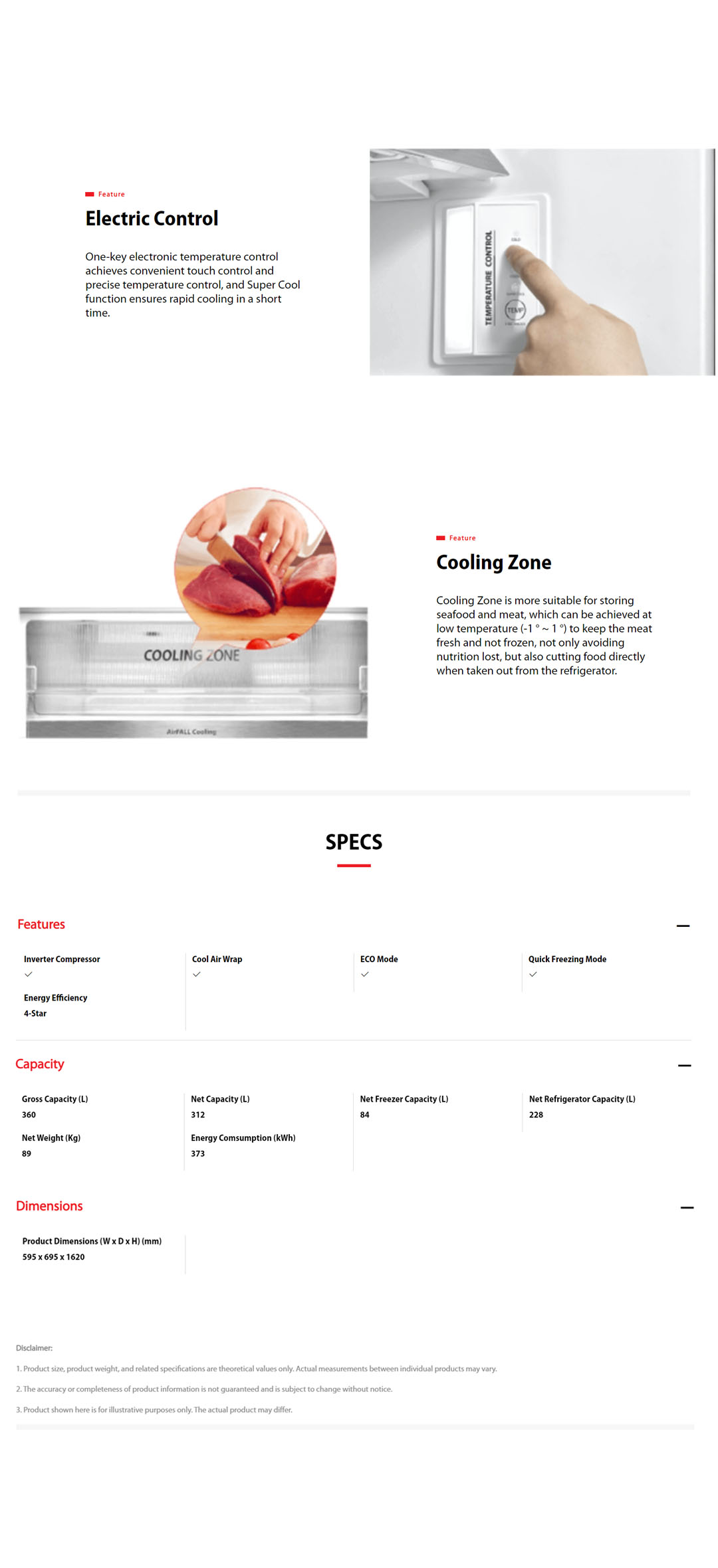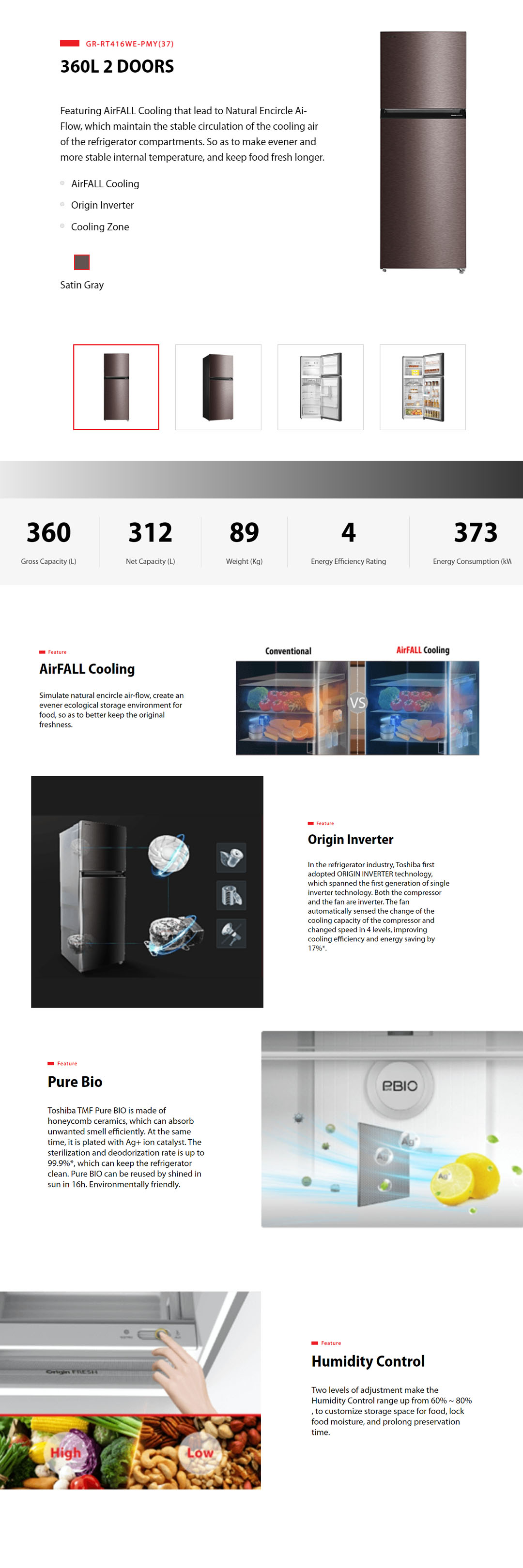 TOSHIBA 360L 2 Doors Inverter Refrigerator GR-RT416WE-PMY(37) | AirFALL Cooling | Origin Inverter | Humidity Control | Refrigerator with 1 Year General & 12 Year Compressor Warranty