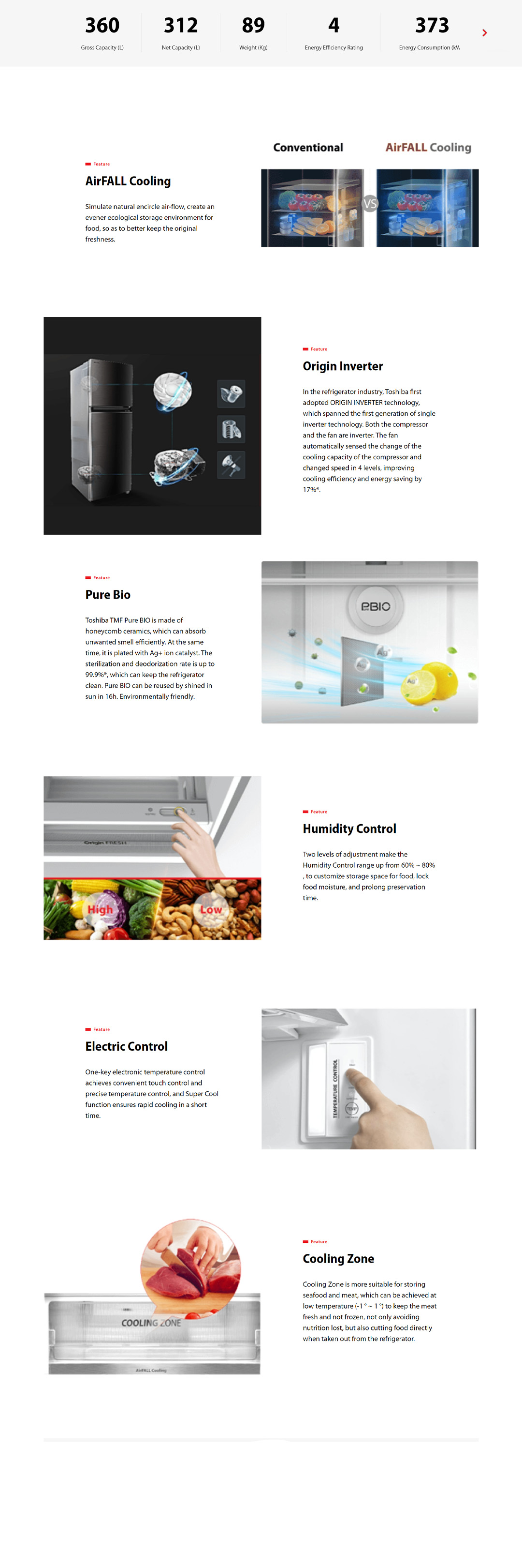 TOSHIBA 360L 2 Doors Inverter Refrigerator GR-RT416WE-PMY(06) | AirFALL Cooling | Origin Inverter | Humidity Control | Refrigerator with 1 Year General & 12 Year Compressor Warranty