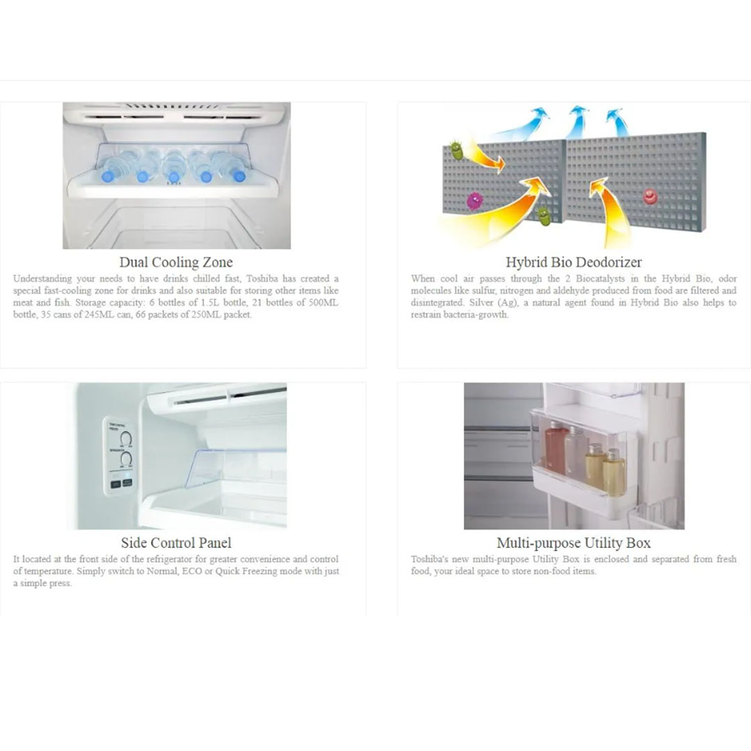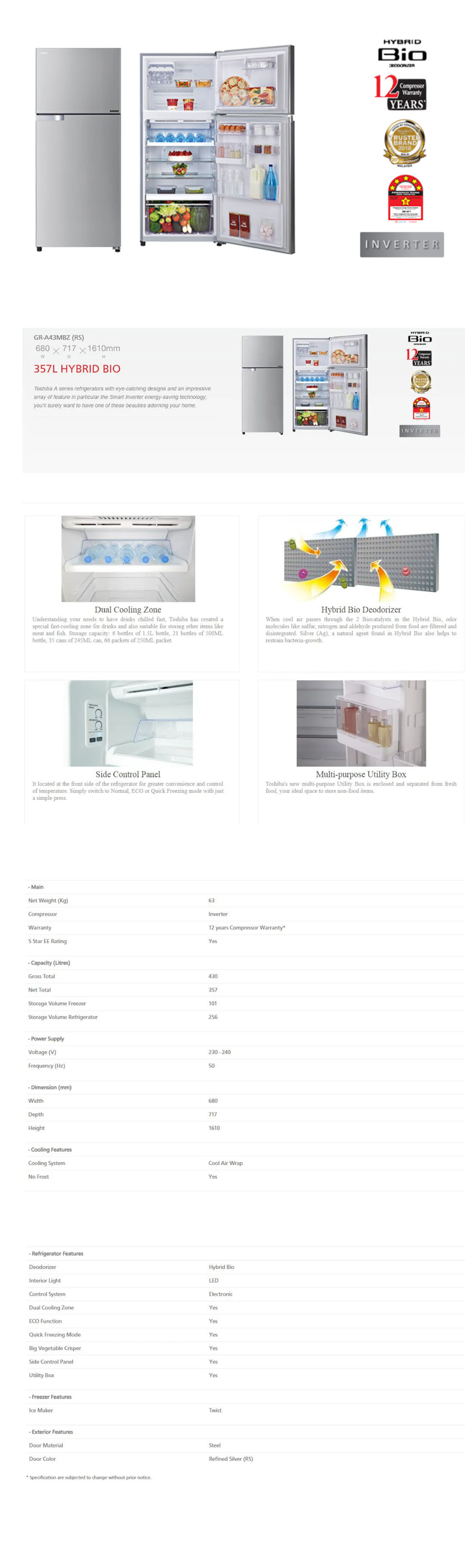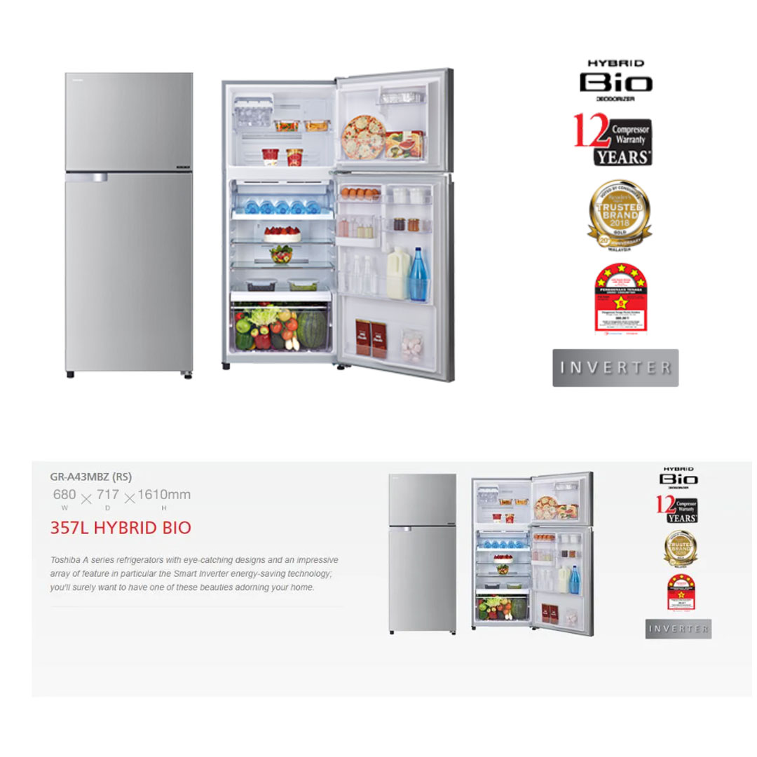 TOSHIBA 430L 2 Doors Inverter Hybrid BIO Refrigerator GR-A43MBZ(RS) | Dual Cooling Zone | Hybrid Bio Deodorizer | Refrigerator with 1 Year General & 12 Year Compressor Warranty