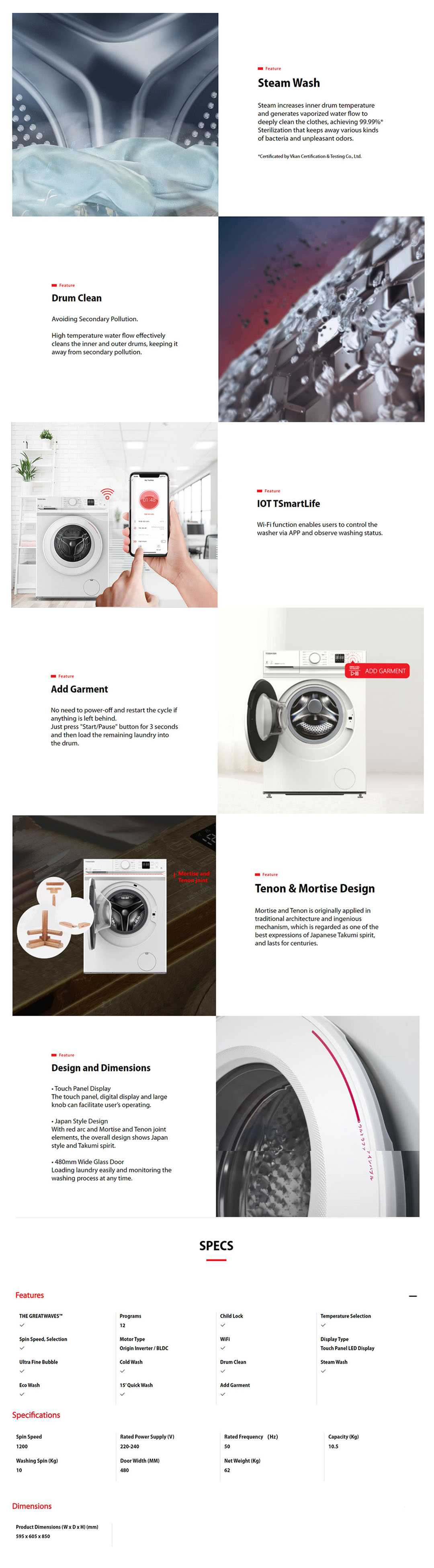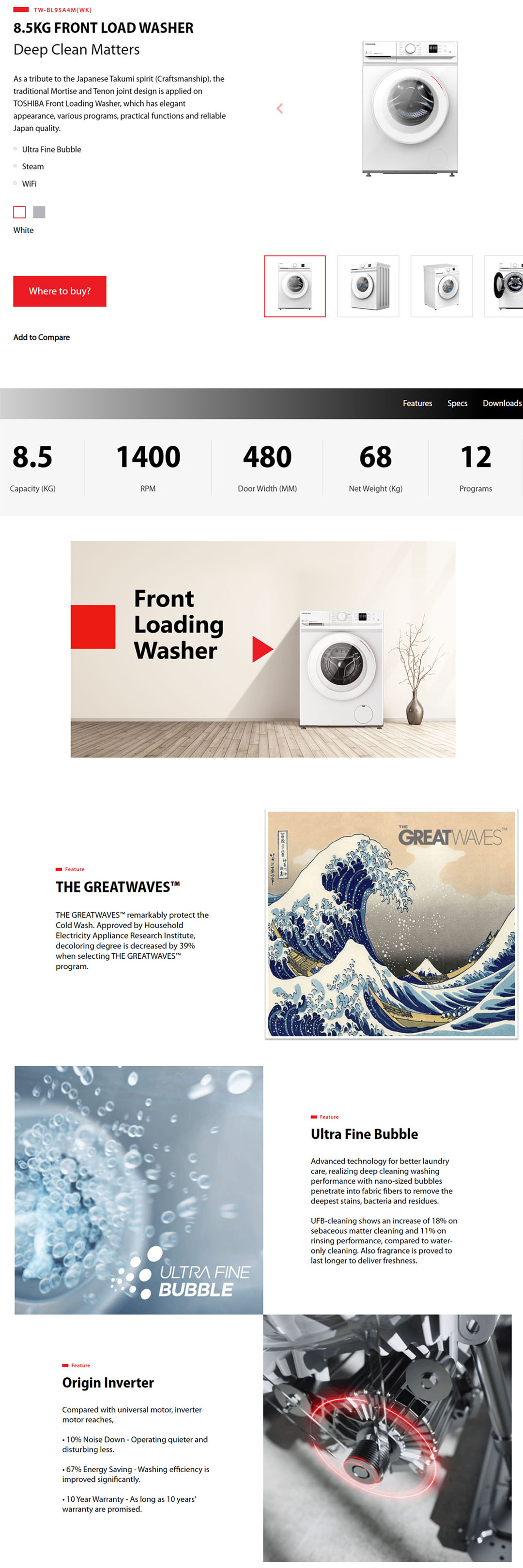 TOSHIBA 8.5KG Front Load Inverter Washing Machine TW-BL95A4M(WK) | Ultra Fine Bubble | Origin Inverter | Steam Wash | Drum Clean | IOT TSmartLife | Add Garment | Washing Machine with 2 Year General Warranty & 2 Year Panel Warranty & 10 Year Motor Warranty