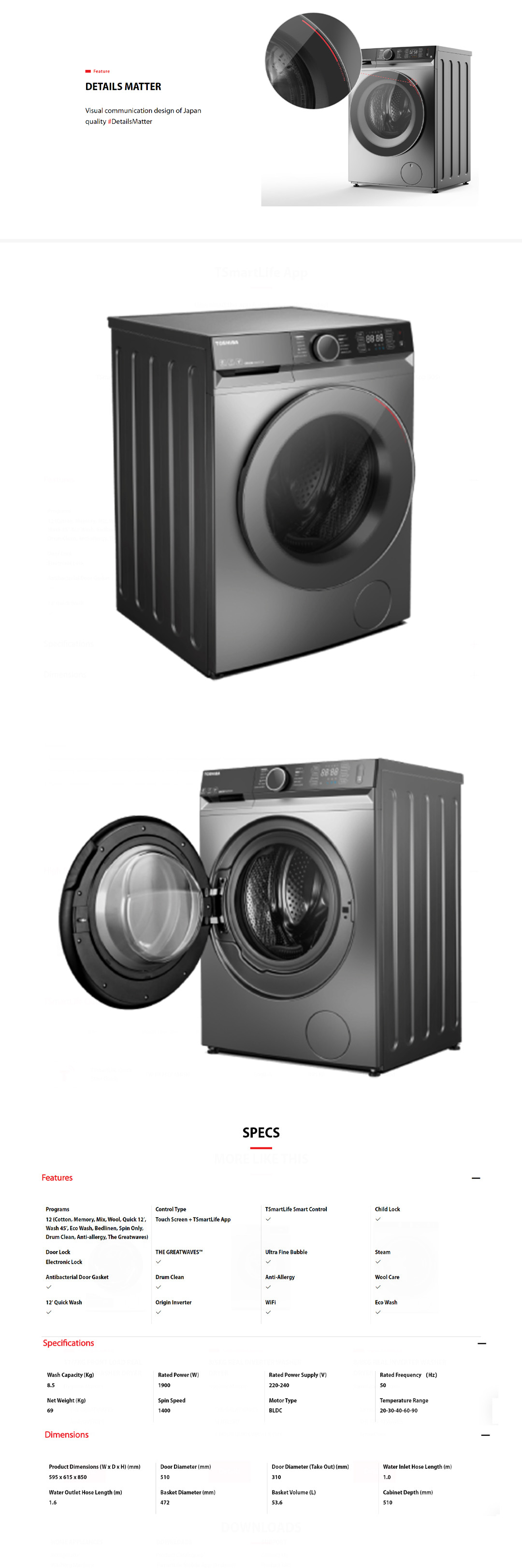 TOSHIBA 8.5KG / 9.5KG / 10.5KG Front Load Origin Inverter Washing Machine with THE GREATWAVES | TW-BK95GF4M(SK) / TW-BK105GF4M(SK) / TW-BK115GF4M(SK) | Smart Control | Steam | Wool Care | Washing Machine with 2 Year Warranty